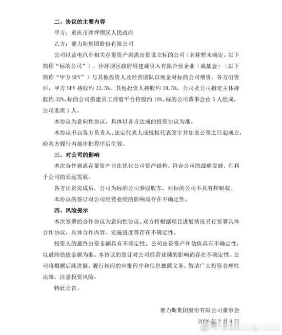 赛力斯拟剥离重要资产全心全意打造问界2月8日,赛力斯公告与重庆沙坪坝区政府签署合作协议,以蓝电汽车存量资产出资设立新公司并引入国资与社会资本.赛力斯从控股转为参股(32%)、不再并表,核心目标是战略聚焦问界、财务减负与风险隔离,全力推进高端化与规模扩张。新公司中,董事会5人,赛力斯仅1席,经营决策由政府+新团队主导。具体到持股方面,沙坪坝区政府平台33.5%(第一大股东);赛力斯及关联方32%(参股);社会资本18.5%;员工持股16%。蓝电出表后,赛力斯可降低负债率、改善现金流与利润表,减少低端业务对财报的拖累,轻装投入问界的技术迭代与产能扩张。引入政府资本兜底,赛力斯仅参股不控股,实现风险隔离;同时强化与重庆基地的政策、资源协同,为问界发展提供更稳定的本地支持。当前问界已成为赛力斯销量与利润核心,2026年1月达成 100 万辆里程碑,剥离低端、亏损边缘的蓝电(2025 年销量约2万辆),集中研发、渠道、营销资源押注问界高端化与快速上量。