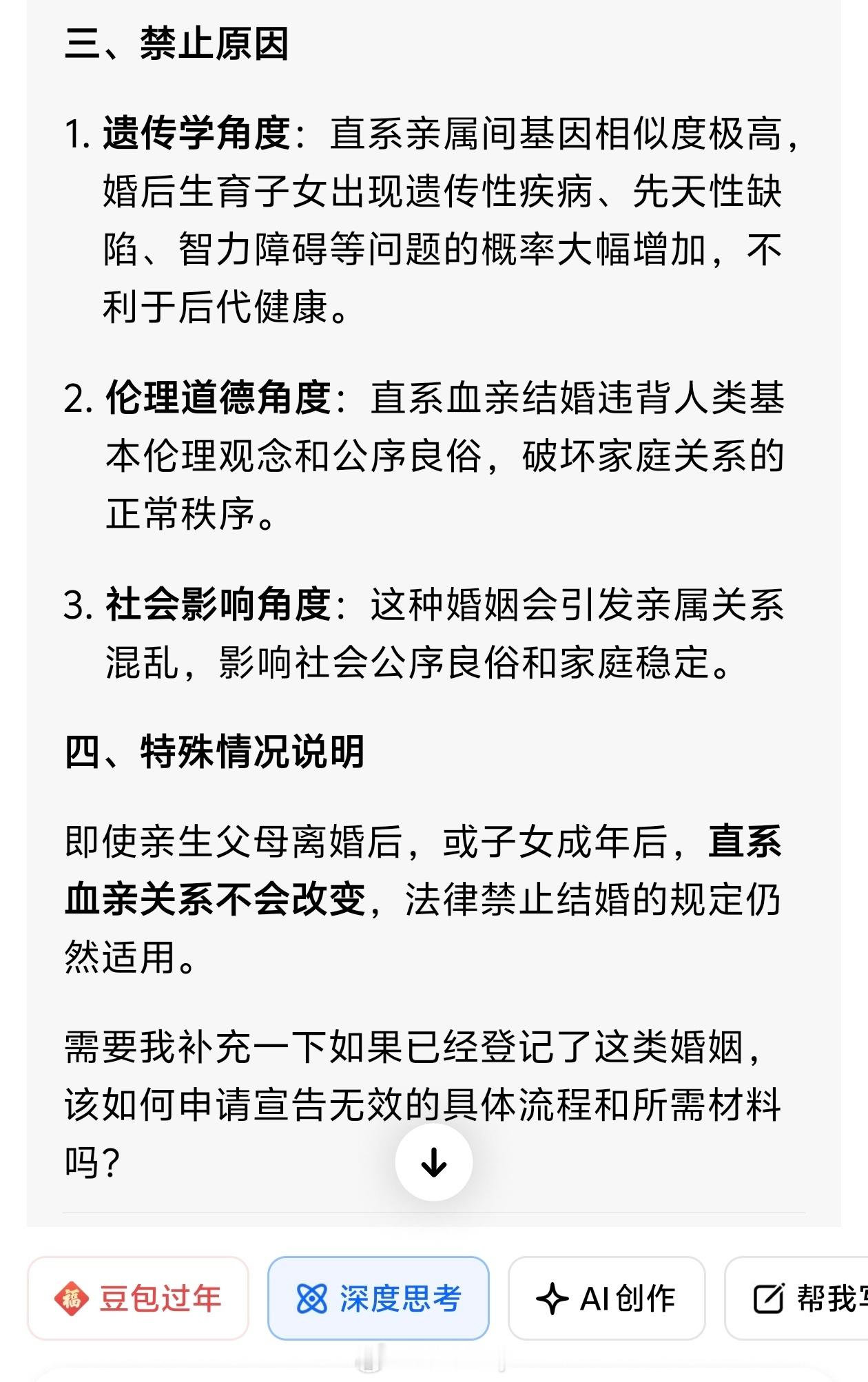问AI亲生父母之间能不能结婚 AI被训练傻了,AI也是根据现有资料深度思考分析的,如果搜集的资料本身就问题,那答案肯定也是不对的,所以人工审核纠正匹配正确价值观也非常重要。我刚试了一下..答案还是很奇怪的。