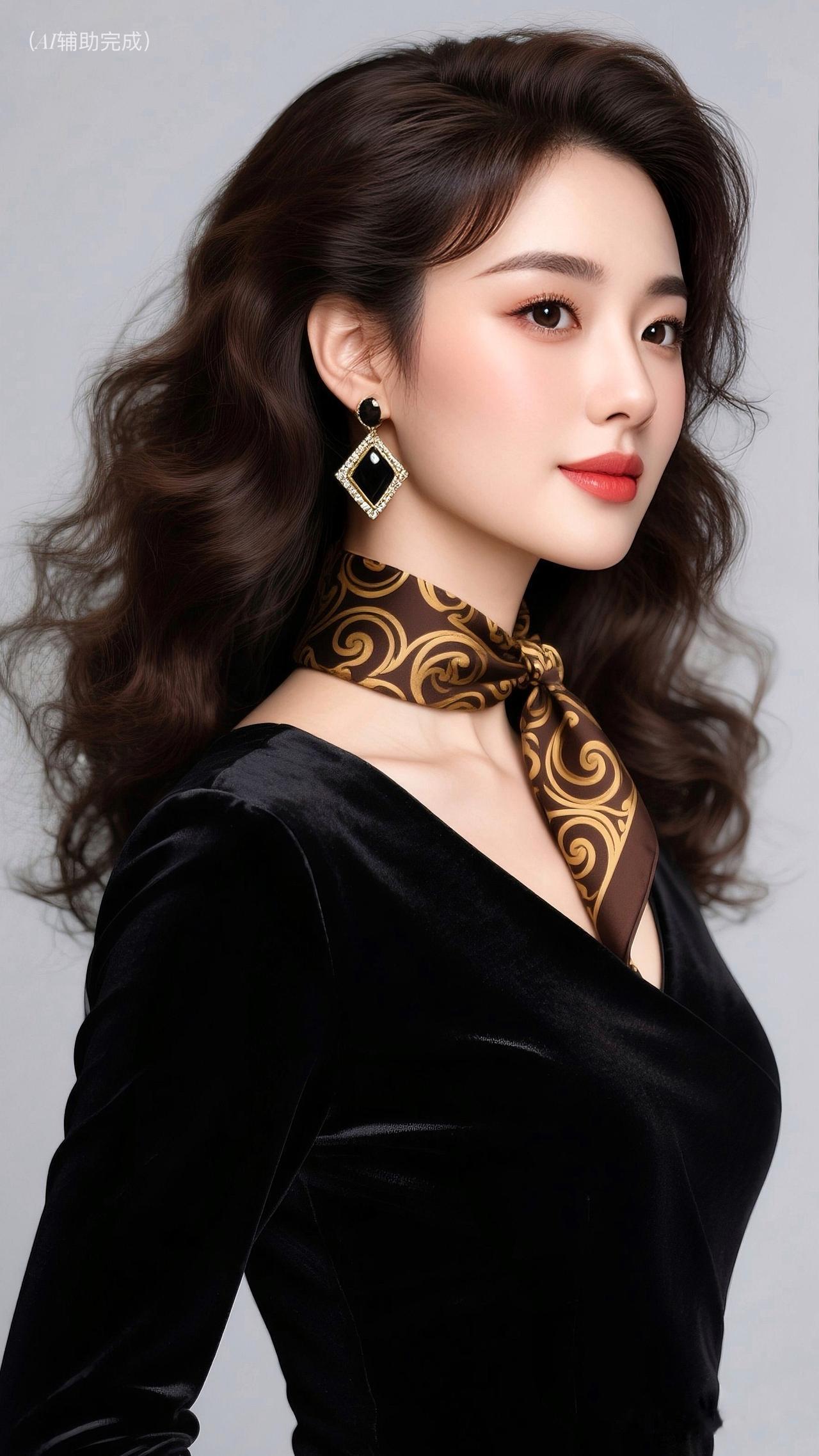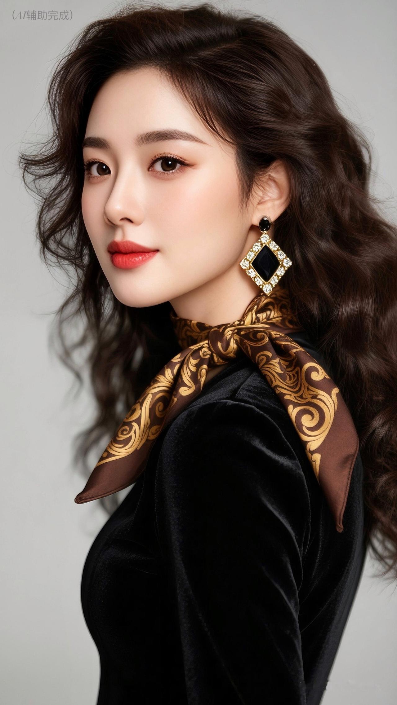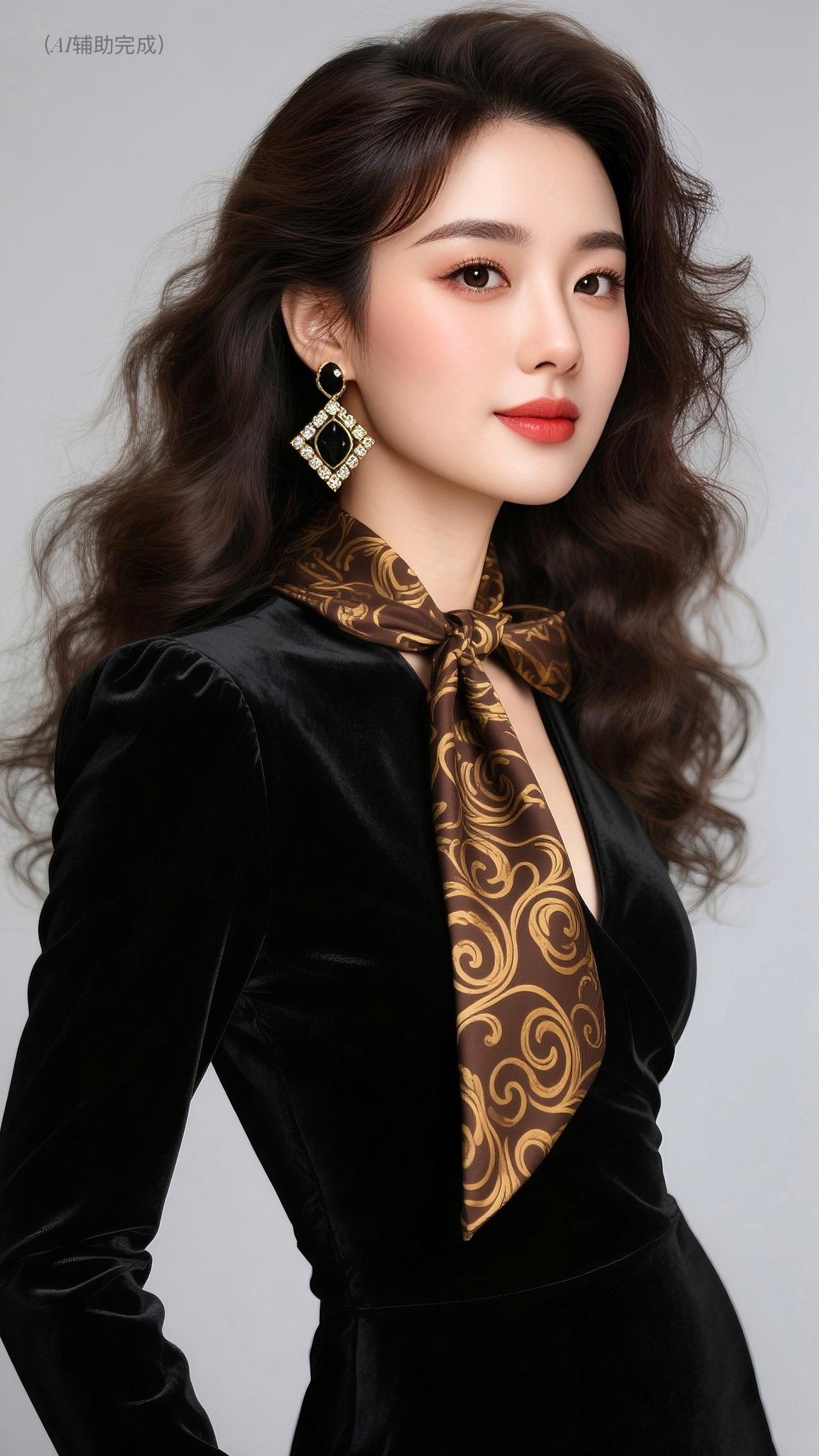 九帧同绘复古贵气仙。深棕大波浪如绸垂,发梢轻扬漾柔光。黑丝绒上衣裹雅姿,棕底金纹丝巾添复古韵。黑金几何耳环耀华贵,眉眼含情眸藏星,红唇娇艳点绛唇。浅灰虚化衬静谧,高贵典雅如画中仙,一眼沦陷!
