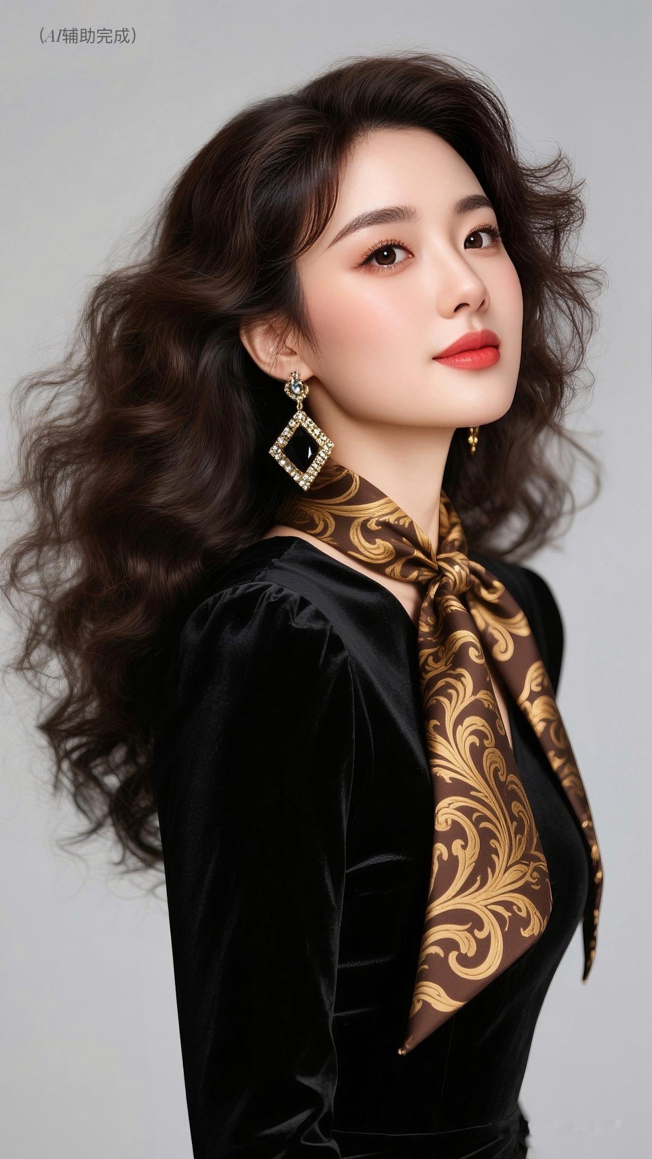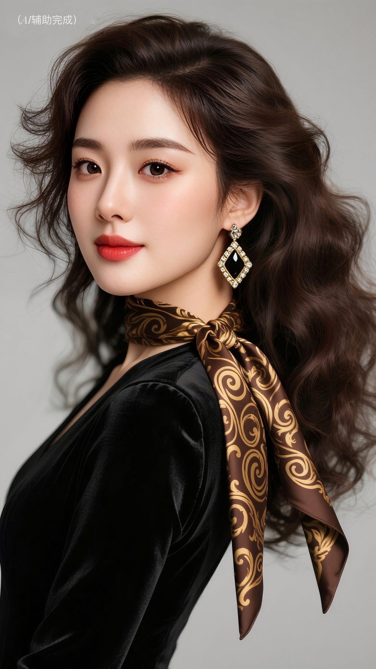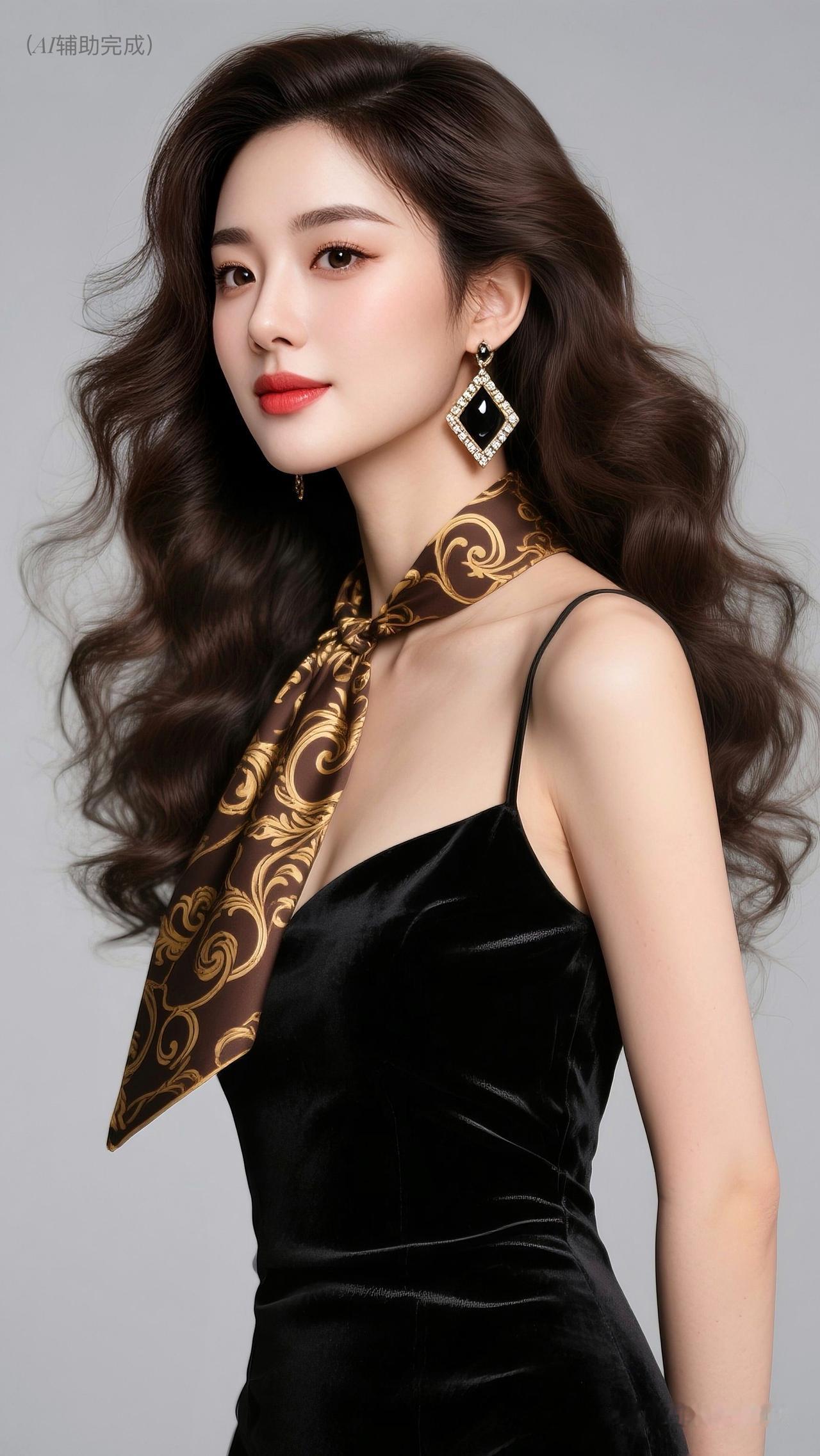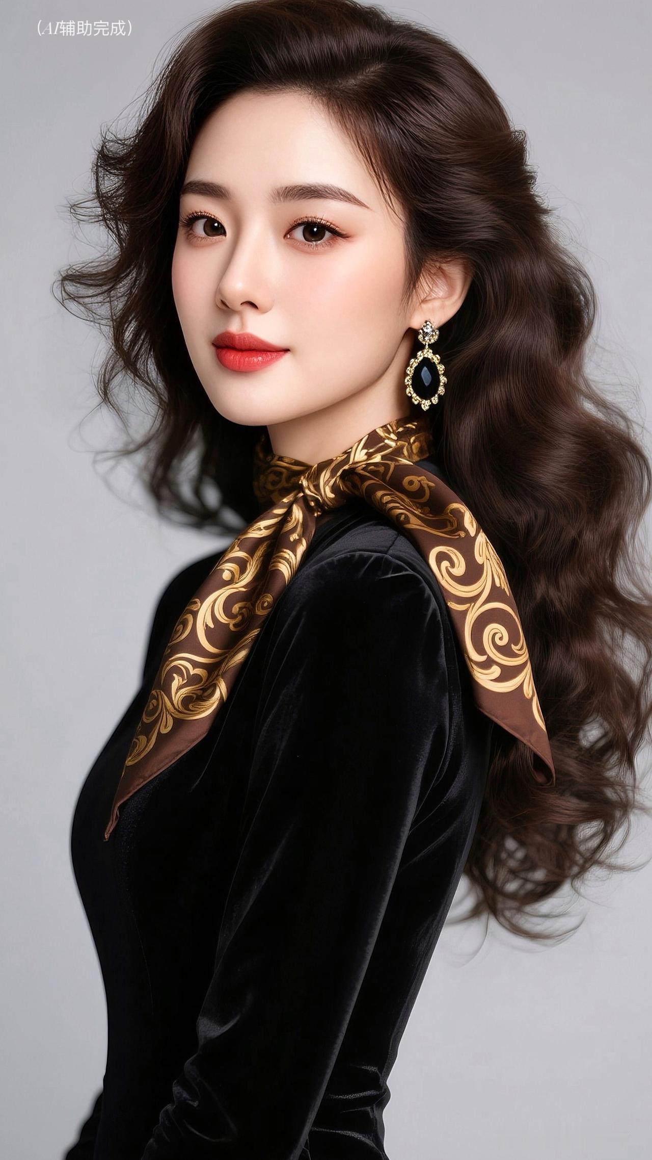 九帧同绘复古贵气仙。深棕大波浪如绸垂,发梢轻扬漾柔光。黑丝绒上衣裹雅姿,棕底金纹丝巾添复古韵。黑金几何耳环耀华贵,眉眼含情眸藏星,红唇娇艳点绛唇。浅灰虚化衬静谧,高贵典雅如画中仙,一眼沦陷!