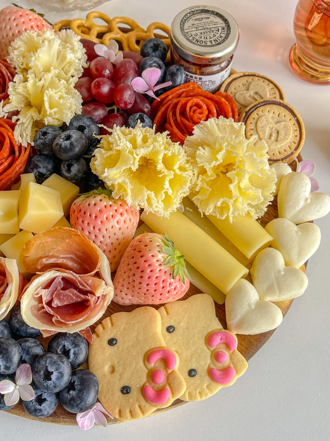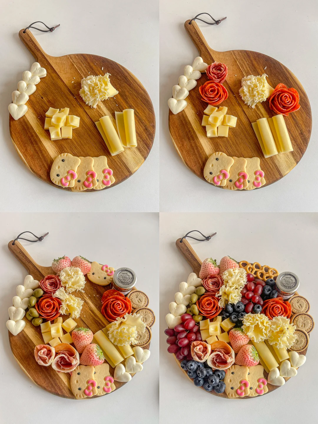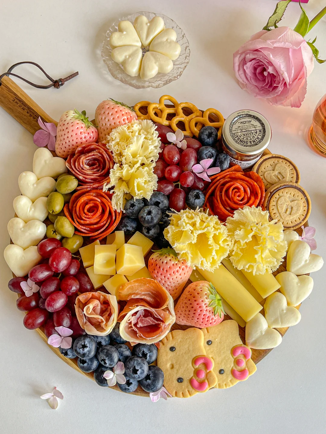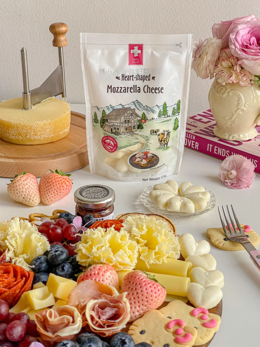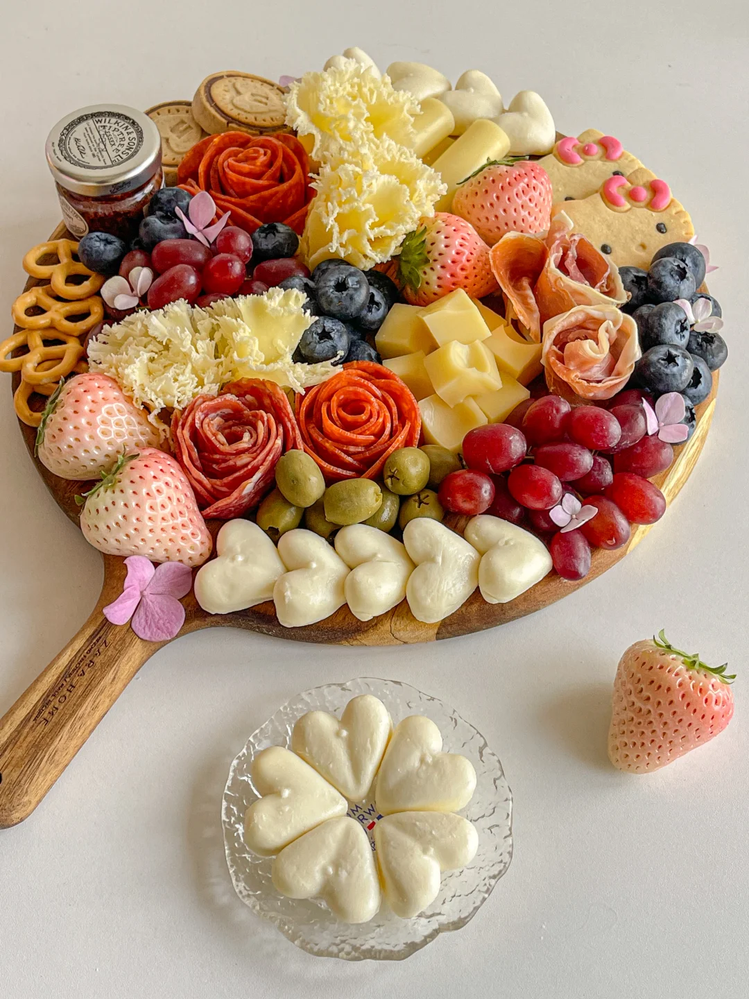 瑞慕莫兹瑞拉爱心小酪➕泰德莫尼AOP奶酪➕大孔奶酪片➕埃曼塔大孔奶酪➕萨拉米➕意大利火腿片➕果酱➕饼干➕草莓➕葡萄➕蓝莓➕橄榄