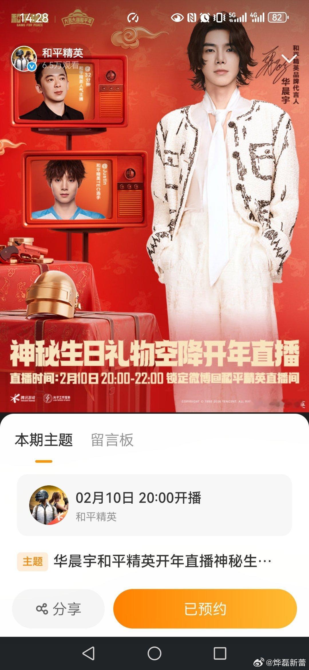 华晨宇游戏直播欢乐局 和平精英品牌代言人 今晚8点到10点直播,一起去收看吧,一起和华晨宇互动,还可以一起解锁战场新玩法。 回顾2025年我几乎每周都在玩和平精英,让我开心刺激,2026年我期待和平精英推出新的玩法和皮肤、角色,让游戏更有挑战,