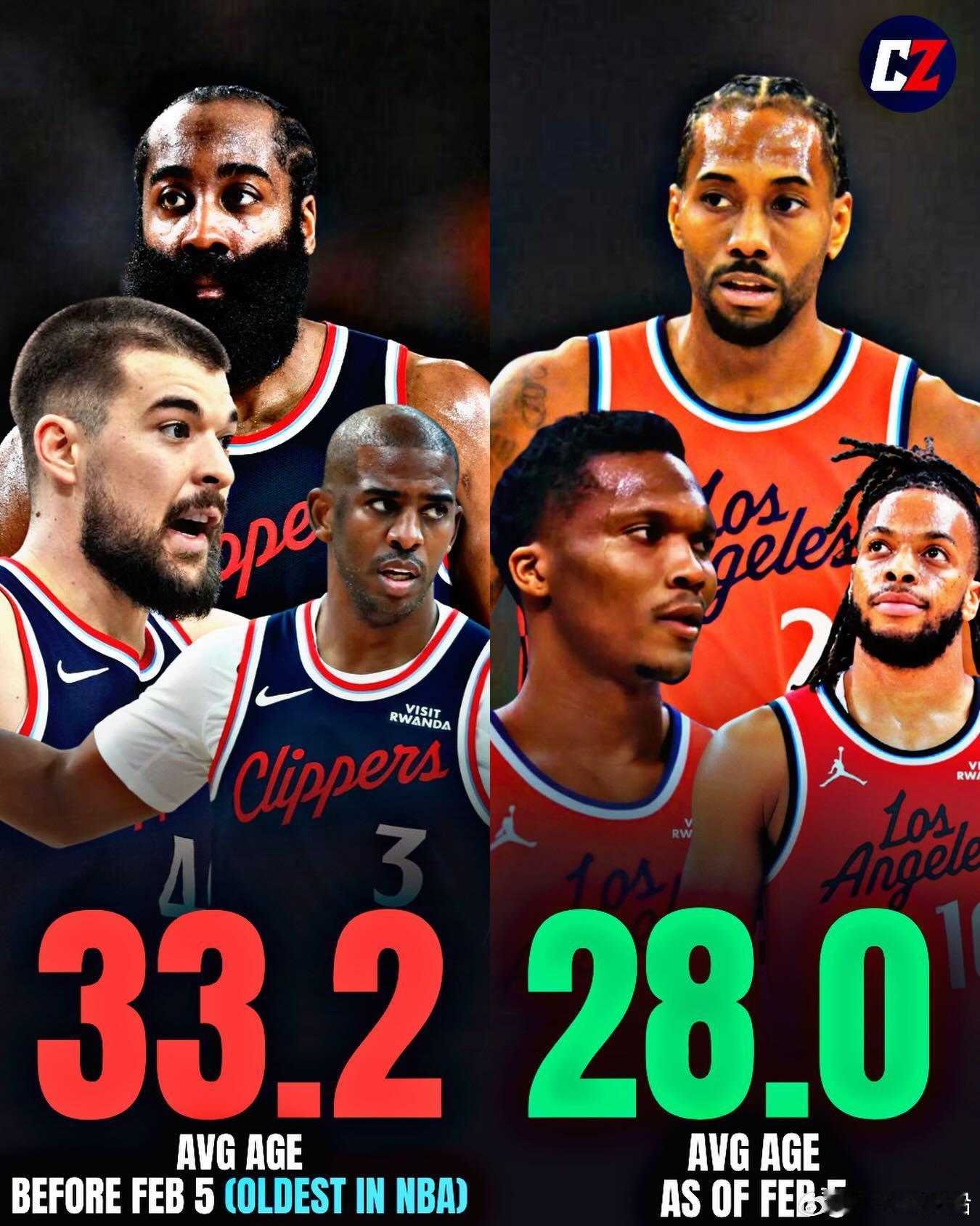 交易截止日过后,快船从联盟最老(33.2岁)大幅年轻化至28.0岁,目前大名单中半数为25岁以下球员。篮球年末狂欢季