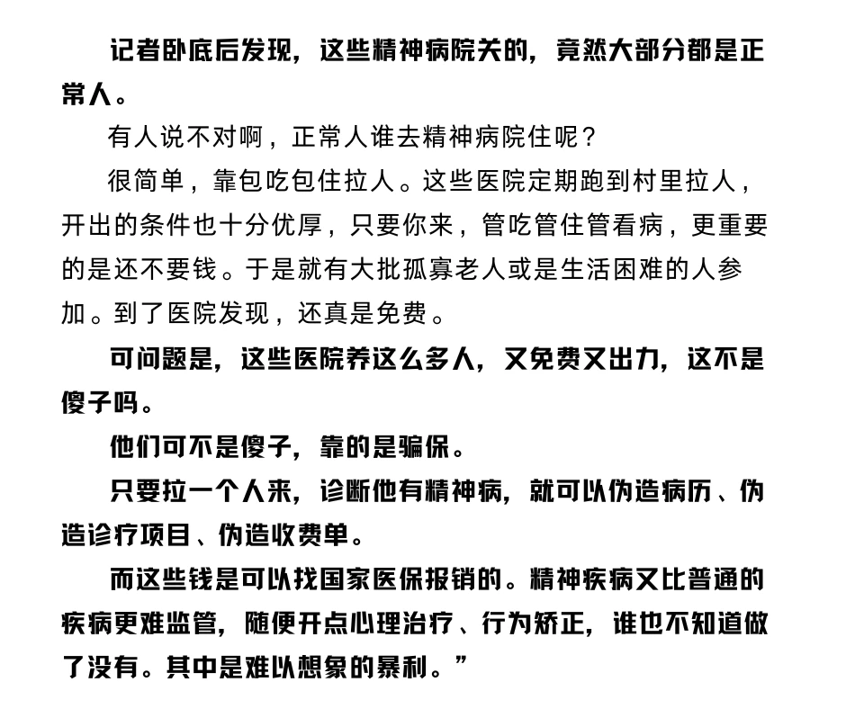 只要拉一个人,诊断有精神病,就可以伪造病历、诊疗项目、收费单。而这些是可以找医保报销的。