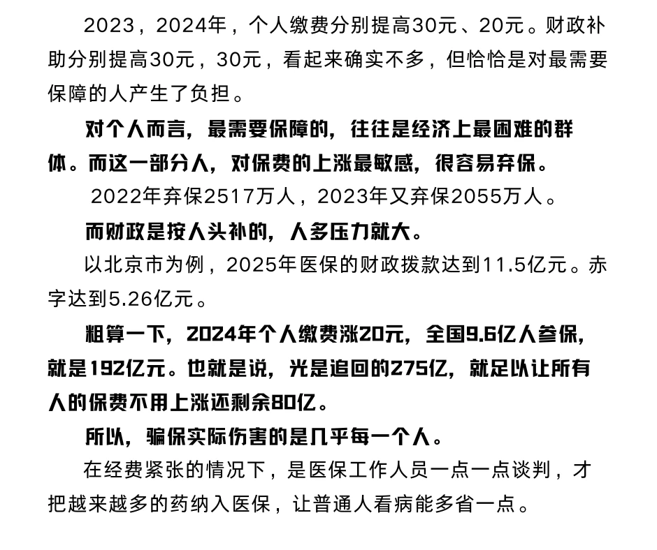 粗算一下,2024年个人缴费涨20元,全国9.6亿人参保,就是192亿元。光是追回的275亿,就足以让所有人的保费不用上涨还剩余80亿。