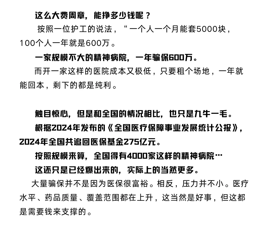 根据2024年《全国医疗保障事业发展统计公报》,2024年全国共追回医保基金275亿元。按照规模来算,全国得有4000家这样的精神病院…这还只是已经爆出来的。