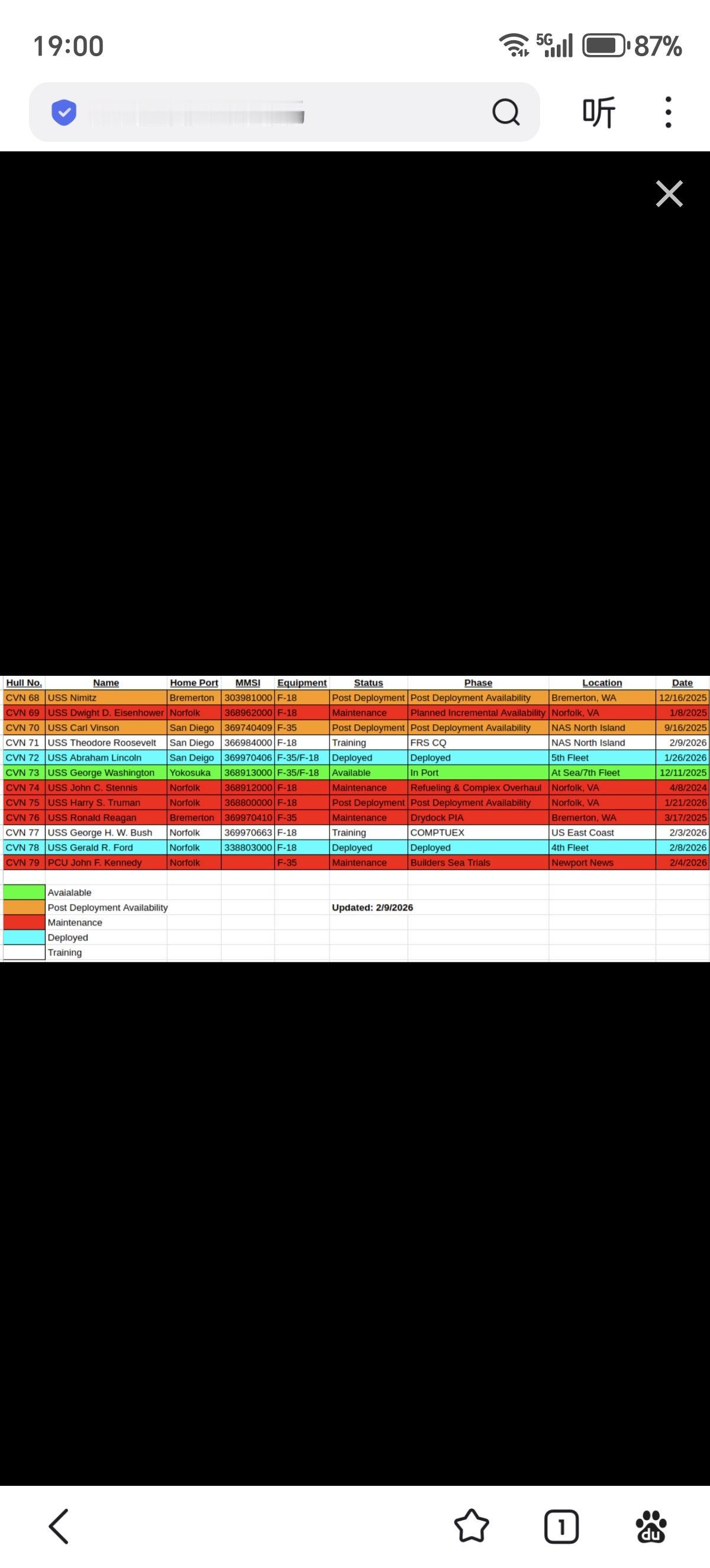 美军航空母舰目前情况。 12艘航空母舰中,1艘准备退役(尼米兹号),5艘在维修,2艘正在部署(林肯号和福特号),1艘正在横须贺休息(华盛顿号),2艘正在部署前恢复训练(罗斯福和布什号),1艘结束部署休息(卡尔文森号)。 如果真要多凑几艘航母干伊朗,那要么把横须贺的华盛顿号拉起来,要么把罗斯福或者布什号拉过去,和林肯号凑一块,但是这最少要大半个月。