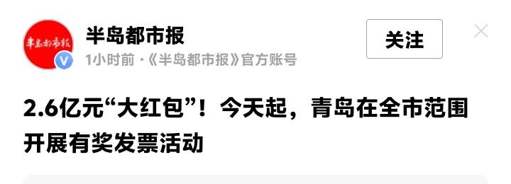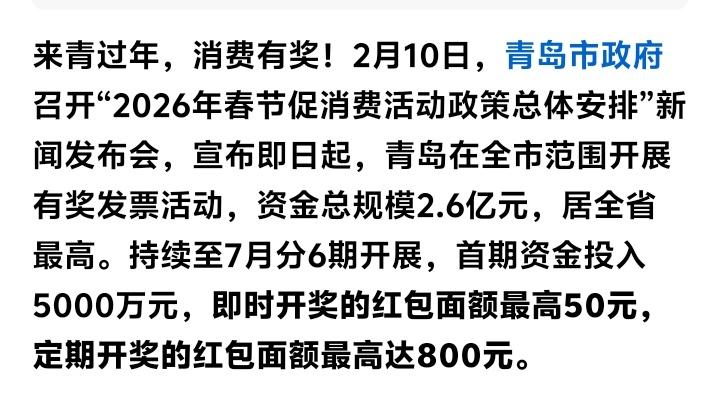 青岛豪掷2.6亿红包雨!全城消费开票就能抽,最高狂送800元现金,你的每一笔买单都可能秒变年终奖! 当全国还在热议年终奖能发多少时,青岛直接给所有市民和游客送上一份开年惊喜。整整2.6亿元的真金白银,就藏在你的日常消费小票里。这不是商业促销,而是政府牵头派发的全民福利,力度堪称全省之最。 从走进餐馆吃一顿热气腾腾的饺子,到商场里为家人添置新衣,甚至看一场电影、住一晚酒店,你花的每一分钱都可能获得意外回报。青岛将枯燥的发票变成了充满期待的幸运卡,让普通消费行为叠加了抽奖的乐趣与实惠。 这背后绝非简单的撒钱游戏。它精准洞悉了人性中那份“小确幸”的渴望——在付出之后,一份即时且意外的回馈最能点燃喜悦。政府巧妙地用“红包”杠杆,撬动的是沉寂的消费欲望,激活的是街头巷尾的烟火气。 透过现象看本质,这是一场多赢的智慧布局。对市民游客,是实打实的优惠;对商家,是引流增收的契机;对城市,则是提振经济、塑造友好形象的高明之举。它让“消费”这个词,从负担变成了充满可能性的快乐投资。 想象一下,刚结完账,手机一震,一个现金红包即刻入账。这种即时满足感,像游戏中的即时奖励,让人欲罢不能。而每月一次的定期开奖,又埋下了长线期待的种子,让你不自觉间关注起每一次的消费凭证。 活动覆盖八大民生行业,几乎囊括了生活的方方面面。它似乎在温柔地提醒我们:认真生活、安心消费,你的每一次选择都值得被奖励。这种普惠性设计,瞬间拉近了政策与每个人的心理距离。 更有心的是,活动还特意设置了“青岛城市惊喜奖”。这不再仅仅是金钱激励,更是一座城市向每一位到来者表达的温情与诚意。它让“好客山东”不再是一句口号,而是可感知、可获得的亲切体验。 所以,下次在青岛消费,别忘了从容索要那张发票。它或许就是一张幸运券,承载着日常的小确幸,也连接着城市的大心意。这场持续半年的红包雨,你准备好接住了吗? (来源:半岛都市报) 青岛消费红包 2亿惠民福利