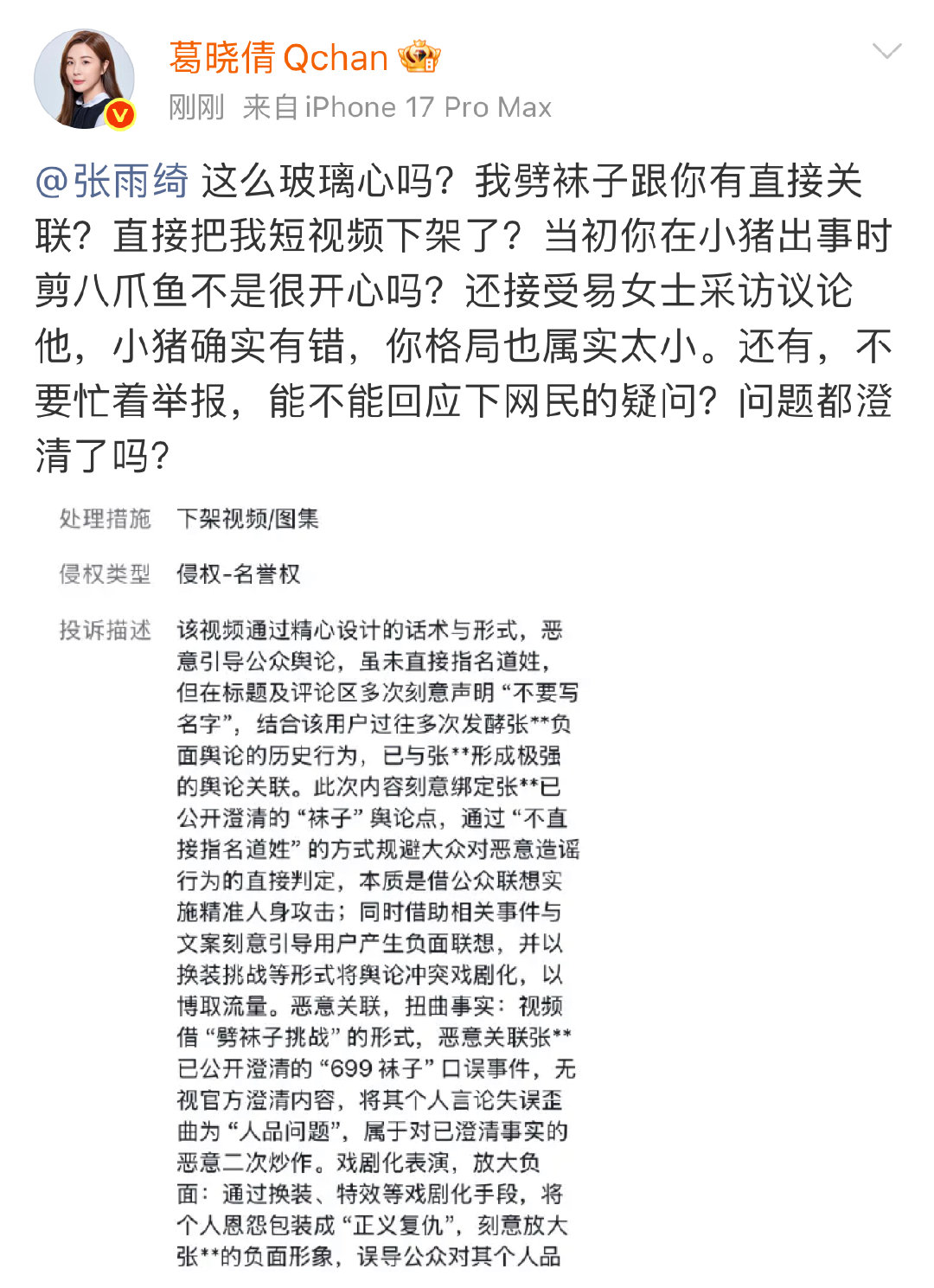 葛晓倩喊话张雨绮这么玻璃心吗 葛晓倩称下架视频换来的是下一份证据 葛晓倩喊话张雨绮这么玻璃心吗,葛晓倩称下架视频换来的是下一份证据。