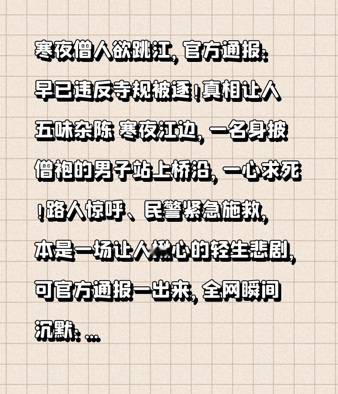 寒夜僧人欲跳江,官方通报:早已违反寺规被逐!真相让人五味杂陈 寒夜江边,一名身披僧袍的男子站上桥沿,一心求死!路人惊呼、民警紧急施救,本是一场让人揪心的轻生悲剧,可官方通报一出来,全网瞬间沉默:这位欲跳江的僧人,并非守规修行者,早已因违反寺庙规定被“迁单”离寺!一念慈悲、一念偏执,故事背后,藏着比跳江更扎心的现实。 事发广东吴川江心岛桥,2月4日晚,释静觉站在桥上,寒风卷起僧袍,眼看就要纵身一跃。民警火速赶到,耐心劝说,终于把人从鬼门关拉了回来,只是轻微擦伤,暂无生命危险。 消息一出,很多人心疼不已:出家人本该清心寡欲、安稳修行,到底受了多大委屈,才会走上绝路?大家纷纷指责寺庙冷漠、质疑世道不公,同情声一片。 就在舆论一边倒同情僧人时,官方与寺庙的通报,彻底反转剧情! 释静觉2021年剃度出家,并非备案宗教教职人员;2024年2月就因违反戒律、对抗僧团、强闯寺院、拒不出示戒牒,被依规“迁单”(强制离寺)。今年1月他多次要求返寺被拒,情绪崩溃,才做出跳江举动。 寺庙按规管理、程序合法;僧人确有过错、违规在先。法理上,寺庙无错;人情上,一个无家可归的修行者流落街头,走到轻生这一步,又让人心酸不已。更有知情人说,他曾为建寺出力,如今却被拒之门外,制度与人情的碰撞,让人百感交集。 一场跳江闹剧,照见的不只是是非对错,更是规矩与慈悲的平衡。 寺有寺规,法有法度,违规被逐,合情合理;但一个迷途之人走到绝境,也提醒我们:制度之外,不该少了温情,修行之路,更该守住初心。 出家不是逃避,守规才是修行;轻生解决不了问题,偏执只会伤害自己。 愿这位僧人能放下执念、好好生活,也愿世间多一点理解与包容,让每一个走投无路的人,都能找到回头的岸。