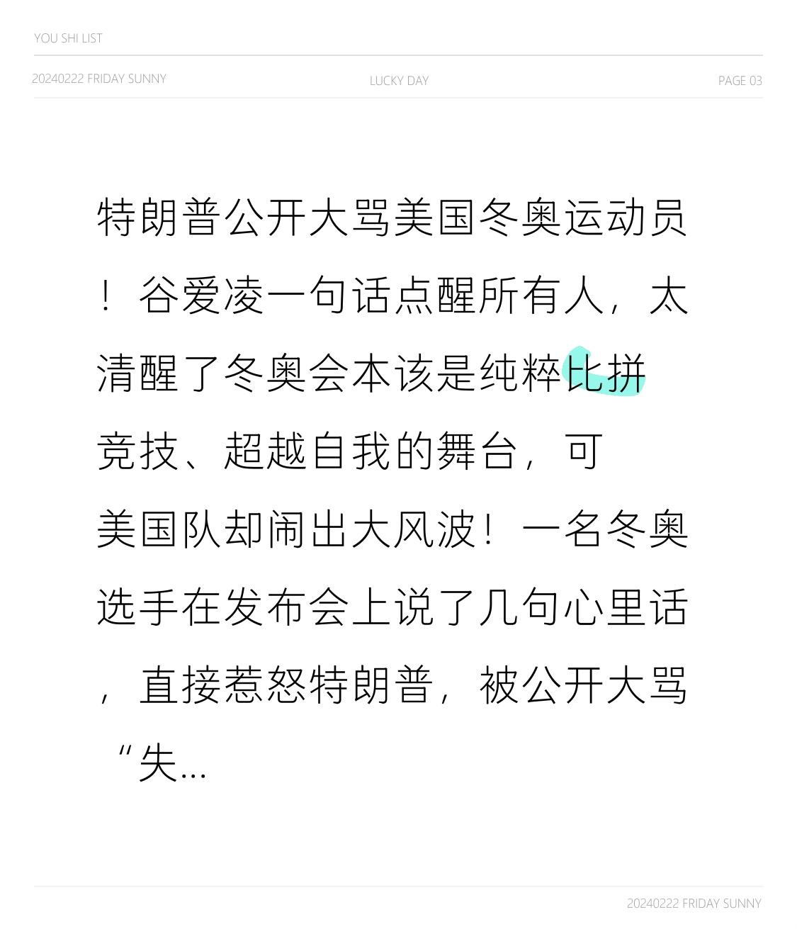 特朗普公开大骂美国冬奥运动员!谷爱凌一句话点醒所有人,太清醒了 冬奥会本该是纯粹比拼竞技、超越自我的舞台,可美国队却闹出大风波!一名冬奥选手在发布会上说了几句心里话,直接惹怒特朗普,被公开大骂“失败者”“不配参赛”,舆论瞬间炸锅!更意外的是,谷爱凌当场发声,一句话戳破真相,网友直呼:格局拉满! 事情起因很简单:美国滑雪运动员亨特·赫斯,在冬奥赛后采访中坦言,身披美国国旗参赛,内心情绪复杂。他直言,不认同国内一些争议事件,披着国旗不代表要无条件认同一切。这番话,只是运动员的真实心声,没有恶意攻击,更没有违背体育精神。 可谁也没料到,这番坦诚发言,彻底激怒了特朗普。他立刻在社交平台发文怒批,用词十分激烈:赫斯是真正的失败者,不想代表美国就别来参赛,根本不配进国家队,让人没法为他加油! 总统公开炮轰自家运动员,瞬间引爆全网争议。美国国内两极分化:有人跟着指责选手“不爱国”,也有大批网友力挺赫斯,认为表达真实想法不是错,当下美国确实有很多让人羞愧的事,运动员有权说真话。队友克洛伊·金也公开声援,支持大家自由表达意见。 就在舆论吵得不可开交、体育被政治彻底裹挟时,谷爱凌的表态,成为全场最清醒的声音。她遗憾地表示:很可惜,抢走奥运会风头的,竟是和奥运精神毫不相关的纷争。奥运本该专注拼搏、团结、友谊,不该被政治杂音干扰,更不该让运动员为表达心声承受谩骂。 这一转折,直接把事件拉回正轨:大家突然意识到,奥运的初心是体育,不是政治博弈;运动员的使命是拼搏,不是被迫“完美表态”。特朗普的大骂,看似维护所谓“爱国”,实则违背了奥运最本真的意义。 这件事,看似是美国内部的舆论风波,却给所有人上了一课:真正的爱国,不是噤声盲从,不是强迫统一声音;真正的体育精神,无关立场纷争,只关乎拼搏与尊重。 把赛场变成政治秀场,用谩骂压制真诚表达,只会让奥运失去原本的光芒。谷爱凌的清醒,恰恰点破了最朴素的道理:让体育归体育,让人心归真诚,别让偏见与戾气,玷污了最纯粹的竞技梦想。 看完这一幕,你觉得运动员有权表达真实想法吗?特朗普的大骂,到底是维护国家,还是小题大做?评论区聊聊你的看法!