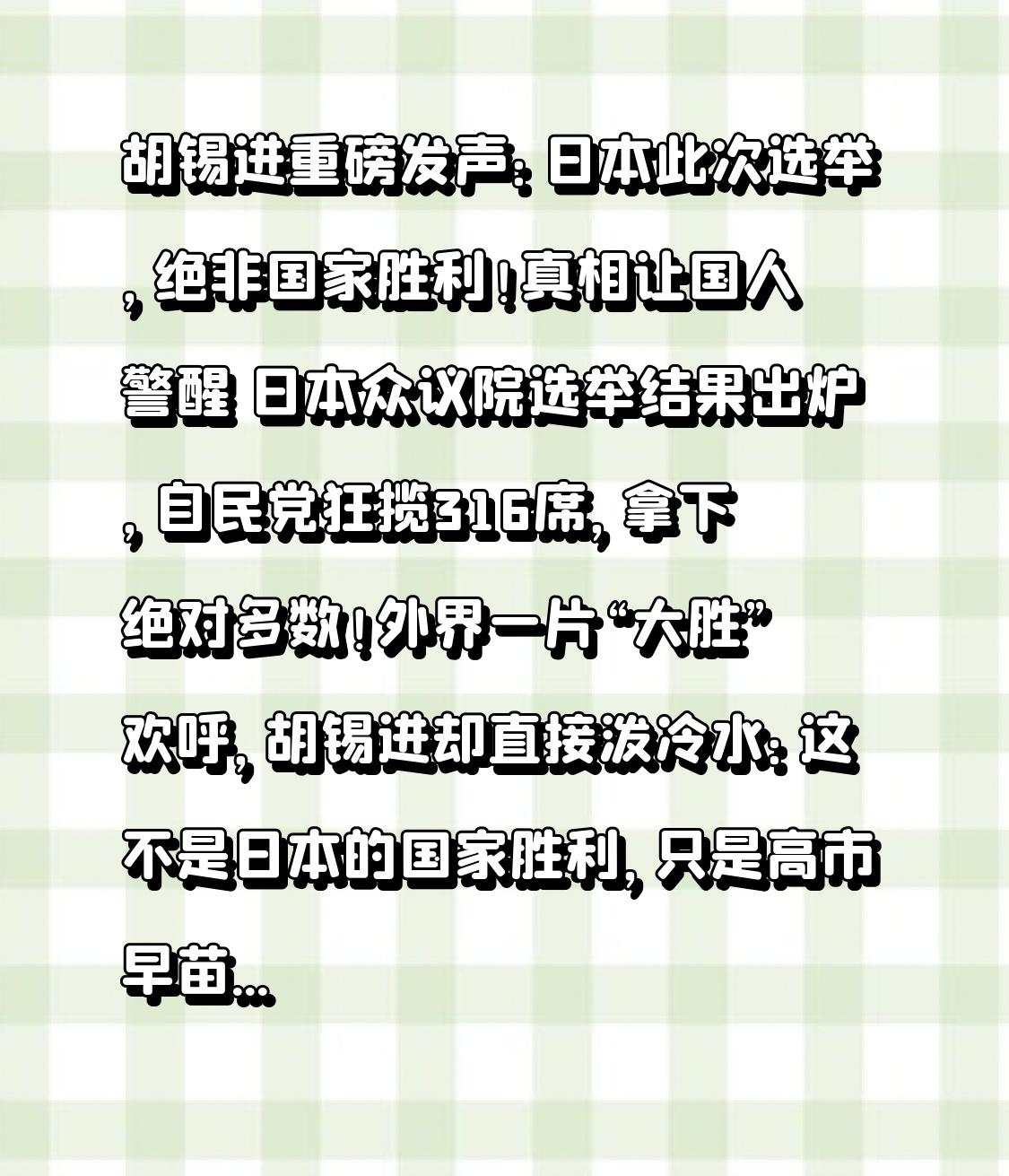 胡锡进重磅发声:日本此次选举,绝非国家胜利!真相让国人警醒 日本众议院选举结果出炉,自民党狂揽316席,拿下绝对多数!外界一片“大胜”欢呼,胡锡进却直接泼冷水:这不是日本的国家胜利,只是高市早苗个人的政治胜利!一句话点破本质,这场看似光鲜的选举,藏着日本的民生困境与战略危机,更给我们敲响警钟! 短短16天闪电选举,高市早苗凭借激进表态与选举操作,带领自民党创下历史最佳战绩,执政联盟占据超七成席位,修宪、扩军之路几乎畅通无阻。西方纷纷祝贺,特朗普公开力挺,日本国内更是一片“胜利”狂欢,仿佛国家迎来新的辉煌。 就在所有人被这场胜利迷惑时,胡锡进直言不讳:这场胜选,靠的是煽动情绪、转移矛盾,而非解决民生痛点。日本民众正面临经济停滞、物价高涨、民生难题缠身,选举却回避核心问题,用政治操弄忽悠选民,本质是把国家带向歧途。 更扎心的真相随之曝光:这场“大胜”背后,是日本战略上的全面被动。对外过度依附美国,缺乏自主空间;对华强硬姿态,只会加剧地区紧张,损害自身经济利益;对内扩军修宪,加重财政负担,忽视百姓真实需求。 胡锡进一针见血指出,高市早苗效仿安倍老路,靠货币宽松、财政补贴讨好民众,只会留下债务隐患。所谓的政治胜利,牺牲的是日本的长远发展,看似赢了选票,实则输了未来,这根本不是国家之福,而是隐患之源。 一场选举,看清一个国家的选择。真正的国家胜利,从来不是政治博弈的胜出,不是对外强硬的姿态,而是百姓安居乐业、经济稳步发展、国家行稳致远。 日本这场选举的喧嚣,提醒着每一个人:民生才是根本,发展才是正道,靠煽动对立、回避问题换来的胜利,终究是空中楼阁。 我们保持警惕的同时,更要坚守自身发展节奏,专注于国计民生,这才是一个国家真正的强大与胜利。为胡锡进的清醒点评点赞,也愿我们始终保持理性,看清国际局势的本质!