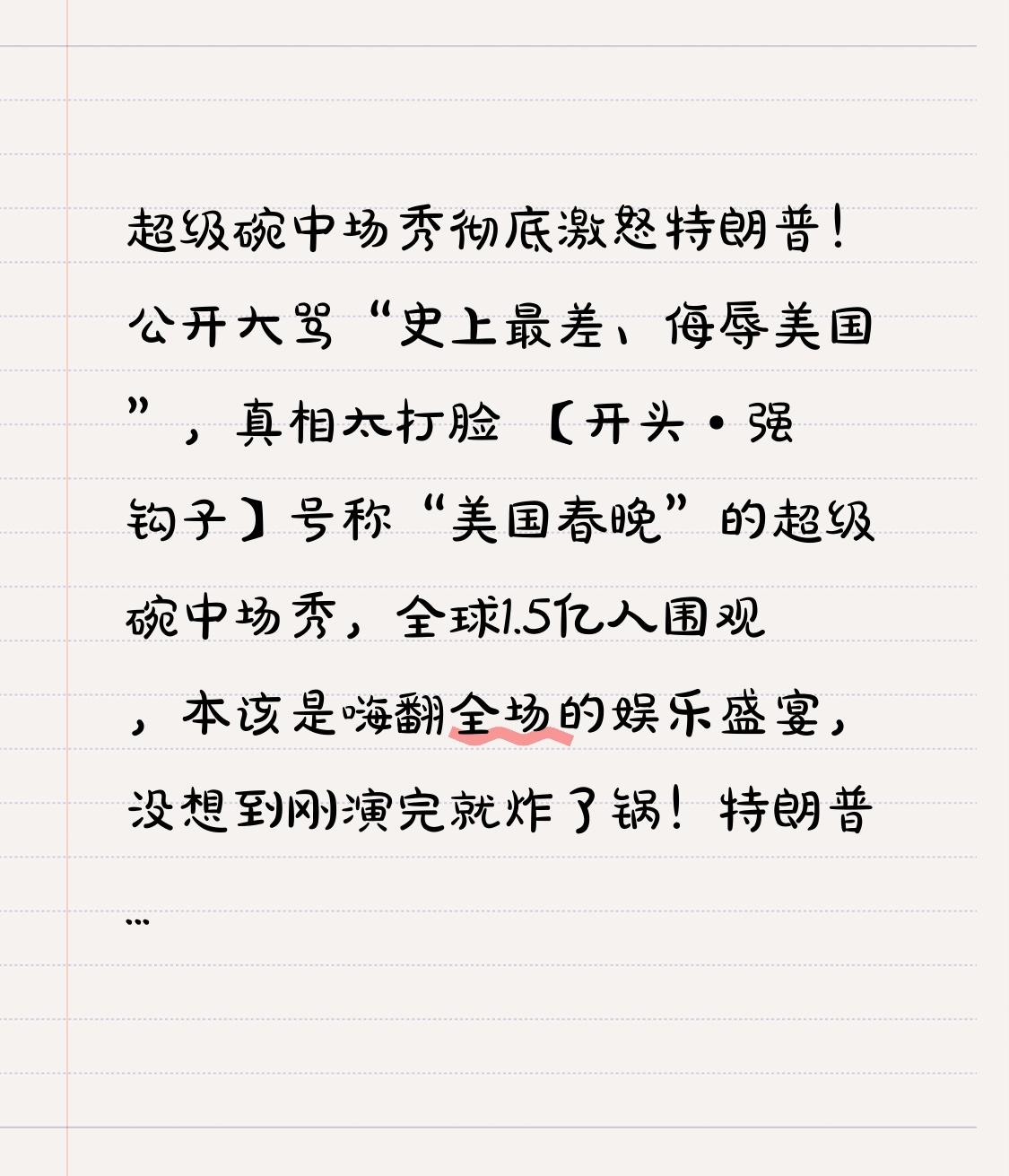 超级碗中场秀彻底激怒特朗普!公开大骂“史上最差、侮辱美国”,真相太打脸 号称“美国春晚”的超级碗中场秀,全球1.5亿人围观,本该是嗨翻全场的娱乐盛宴,没想到刚演完就炸了锅!特朗普直接在社交平台发飙,大骂表演糟透了、史上最差、令人作呕,甚至说这是对美国的“侮辱和耳光”!到底是什么节目,能把他气成这样?背后真相,直接戳穿美国当下最大的撕裂! 本届中场秀请来顶流歌手“坏痞兔”,这位波多黎各歌手一上台就火力拉满:全程西班牙语演唱,舞台上亮出多国旗帜,传递拉美文化与美洲团结的理念,搭配劲爆舞蹈,收视直接冲顶,台下观众尖叫不断,不少网友直呼“封神”。 可这份热闹,偏偏戳中了特朗普的“怒火点”。他连夜发文怒批:没人听得懂在唱什么,舞蹈不堪入目,完全不符合美国的成功与卓越标准,是给美国形象的沉重打击。这番炮轰,瞬间引爆全美舆论,两边吵翻了天。 就在舆论一边倒互撕时,真相彻底反转! 大家才发现,这位歌手本就长期公开反对特朗普的移民政策,此前还在大选中支持对手,两人早有“旧怨”。更关键的是,超级碗一向主打多元包容,西班牙语演唱、多元文化展示,早已是全球主流舞台的常态,并非针对谁。 特朗普的暴怒,根本不是因为“表演不好看”,而是看不惯这种文化表达,容不下不同的声音。支持者跟着骂“不爱国”,反对者则力挺歌手“勇敢做自己”,一场娱乐秀,硬生生变成美国文化对立、政治撕裂的照妖镜。 一场中场秀,照见的不只是娱乐纷争,更是一个国家的包容度。 娱乐本该归娱乐,文化本该多元共存,用政治情绪绑架舞台,用谩骂压制表达,只会让热闹变闹剧,让团结变对立。 超级碗的掌声,属于热爱与包容;而无端的怒火,只会暴露狭隘与偏见。 这一幕也告诉我们:真正的强大,从不是容不下不同,而是能接纳多样、尊重差异。 看完这场闹剧,你觉得特朗普是在维护美国,还是小题大做?评论区聊聊!