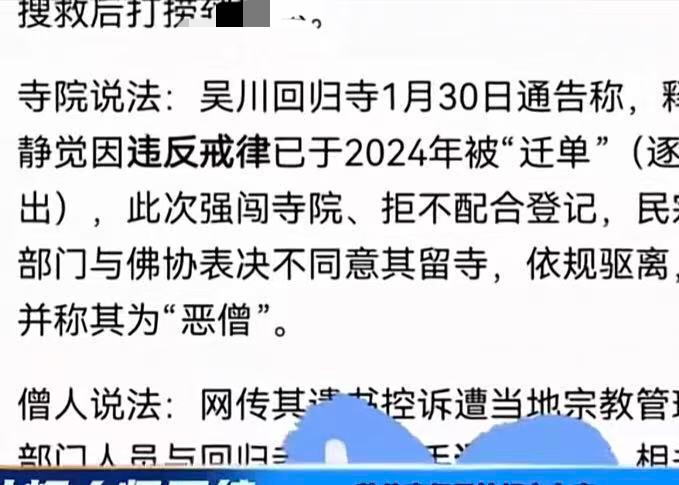 僧人释静觉这一跳,跳出了寺院内出家人的无奈? 2月5日,湛江吴川江心岛大桥,吴川当地一家寺院一名叫“扶灯大师”的僧人释静觉因寺院拒绝了他重回寺院的请求,一跃而下跳进了江中。幸亏被救了上来,人现在还躺在当地的一所医院。 当地寺院以及佛教协会很快作出了回应: 他在两年前因不服管理,违反戒律被逐出寺院。到了今年的一月,他和另外一人想重归寺院居住被拒绝。从整件事来看,寺院按规办事,只是他一时想不开选择跳桥。 网上传的扶灯大师化缘募集资金,造了寺庙,然后有一群类似少林寺前方丈一样的人鸠占鹊巢,把寺庙霸占了搞商业化,变成一门生意。这一说法没根据,只是妄意揣测,是非曲直,当地有关部门正在调查中。