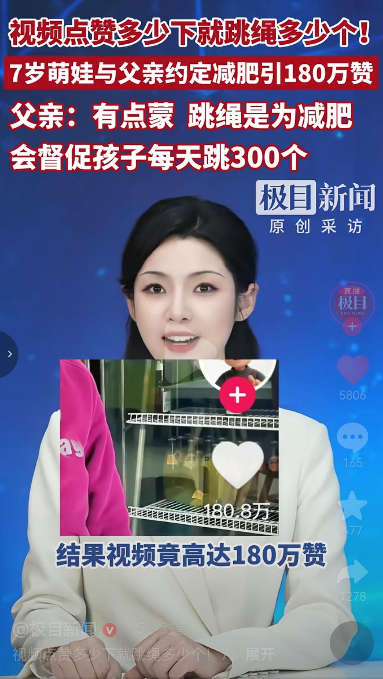 这届网友太热情了,为了帮助萌娃圆梦,真的是疯狂点赞呀!7岁的“糖豆”身高1米32,可是体重已经达到了90斤,因为体重体重有点超标,成为爸爸重点关注对象。 这不,男孩已经放寒假了,也有时间锻炼身体了,爸爸为了帮他减肥,父子俩想出了一个特别的办法——打赌。 这个打赌的内容就是:拍个跳绳视频,视频点赞多少,他就跳多少个绳。 糖豆还特意在一张纸上写下了减肥约定,歪歪扭扭的字迹里写着:“我现在90斤,到开学我胖一斤我给爸爸10块钱,我瘦一斤爸爸给我10块钱。” 下面郑重地签上了自己的名字和爸爸的名字,日期是2026年2月8日。 本来就是父子俩的小玩笑,一开始只有150个赞,男孩按照赌约完成了跳绳,谁知道第二天视频一发,直接炸了,网友太热心了,点赞量直接高达180.8万。 糖豆爸爸说,当时看到点赞量破50万的时候,整个人都蒙了:“我本来就想让他每天跳300个,这下好了,直接干到180万,可能会跳到结婚。” 当糖豆知道点赞量特别高的时候他也有点不想跳了。但在爸爸的鼓励下,他还是咬着牙坚持了下来,现在的目标是每天跳300下,慢慢完成这个180万的约定。 网友看到后评论说:“这孩子太实诚了,说到做到,比很多大人都强。” 也有的网友说:“我反手就是一个赞,不为别的,就想看看这娃到底能坚持到啥时候,顺便监督我自己也动一动!” 还有的网友说:“这180万赞,不是压力,是我们所有人对这个小男孩的鼓励!加油糖豆,我们都在看着你呢!” 其实,网友们之所以疯狂给这个男孩点赞,不是“为难”一个7岁的孩子,而是鼓励孩子继续加油! 我们在他身上,看到了那个曾经为了一个承诺,拼尽全力的自己。是在这个小小的约定里,看到了最珍贵的品质——信守承诺,永不言弃。 而糖豆的爸爸,也用实际行动告诉我们:最好的教育,从来不是逼着孩子去完成不可能的任务,而是陪着他,一起面对挑战,一起慢慢成长。 针对此事,你有什么看法呢?欢迎大家评论区讨论留言