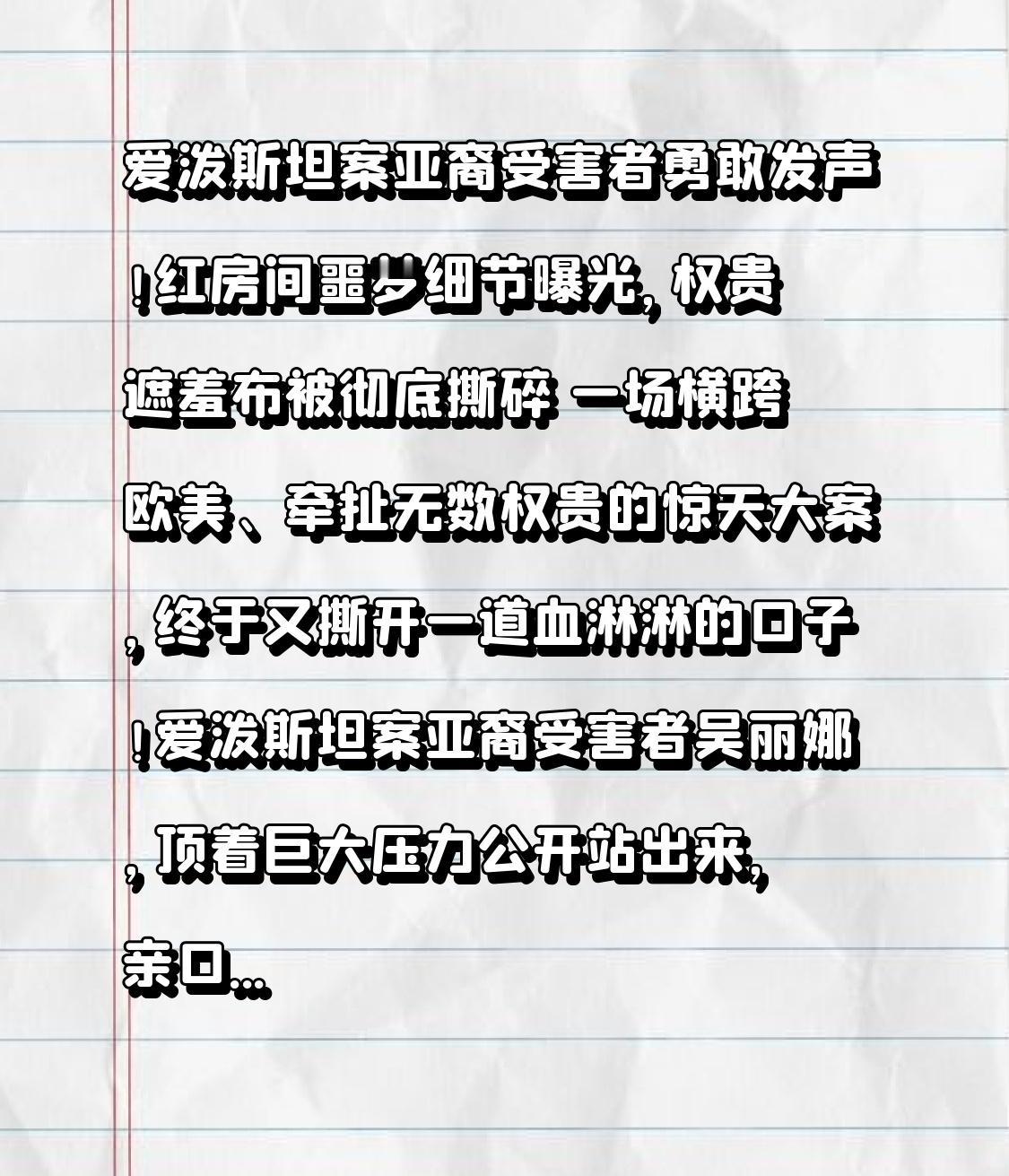 爱泼斯坦案亚裔受害者勇敢发声!红房间噩梦细节曝光,权贵遮羞布被彻底撕碎 一场横跨欧美、牵扯无数权贵的惊天大案,终于又撕开一道血淋淋的口子!爱泼斯坦案亚裔受害者吴丽娜,顶着巨大压力公开站出来,亲口讲述被操控、被虐待、被逼害人的黑暗经历。小红屋、学费公寓、胁迫诱骗,每一个细节都让人头皮发麻,这哪里是“资助”,分明是精心设计的人间炼狱! 2000年,年仅21岁的吴丽娜怀揣艺术梦,经人介绍认识了爱泼斯坦。对方一眼看中她的单纯,以“资助学业”为诱饵,主动提出支付她纽约视觉艺术学院的全部学费,还在曼哈顿为她安排高档公寓。涉世未深的女孩以为遇到人生伯乐,满心感激,却不知自己正一步步走进魔鬼的陷阱。 第一次见面,她就被带进阴森的红房间,遭遇了无法言说的侵犯与虐待。此后近两年时间里,爱泼斯坦用学费和公寓牢牢捆绑她,实施长期精神控制与性剥削。更丧心病狂的是,他逼迫吴丽娜去拉拢其他女孩,她在恐惧与胁迫下三次照做,其中两名女孩同样惨遭侵害,还有人被用纽约大学奖学金收买封口。 那时的她被彻底洗脑,错把剥削当“照顾”,把施虐者当成依靠,直到2019年爱泼斯坦死于狱中,她才猛然惊醒:自己遭遇的一切,都是彻头彻尾的性虐待! 本以为受害者只会默默隐忍,可吴丽娜选择打破沉默!她不再被恐惧裹挟,不再被愧疚吞噬,毅然公开所有细节,指证爱泼斯坦的滔天罪行,也直面自己曾被迫害人的终身悔恨。 这一转折,彻底击碎了权贵们试图掩盖的真相:爱泼斯坦案从来不是孤立事件,而是用金钱、权力编织的罪恶网络,无数年轻女孩被当作猎物,沦为上层圈子的玩物。所谓的“慈善资助”“人生提携”,全是满足私欲的肮脏手段。 吴丽娜的勇敢,是对罪恶最有力的控诉,也是给所有女孩最沉痛的警示:天上不会掉馅饼,免费的馈赠早已暗中标满了代价。别被甜言蜜语迷惑,别被物质诱惑绑架,面对不对劲的亲近、不合理的好处,一定要保持警惕、果断拒绝。 罪恶或许会隐藏,但永远不会消失;沉默只会纵容黑暗,发声才能迎来光明。愿每一位受害者都能走出阴影、获得救赎,愿所有权贵黑幕被一一揭开,更愿世间再无女孩被诱骗、被伤害。 守住底线、保持清醒,才是保护自己最好的铠甲!