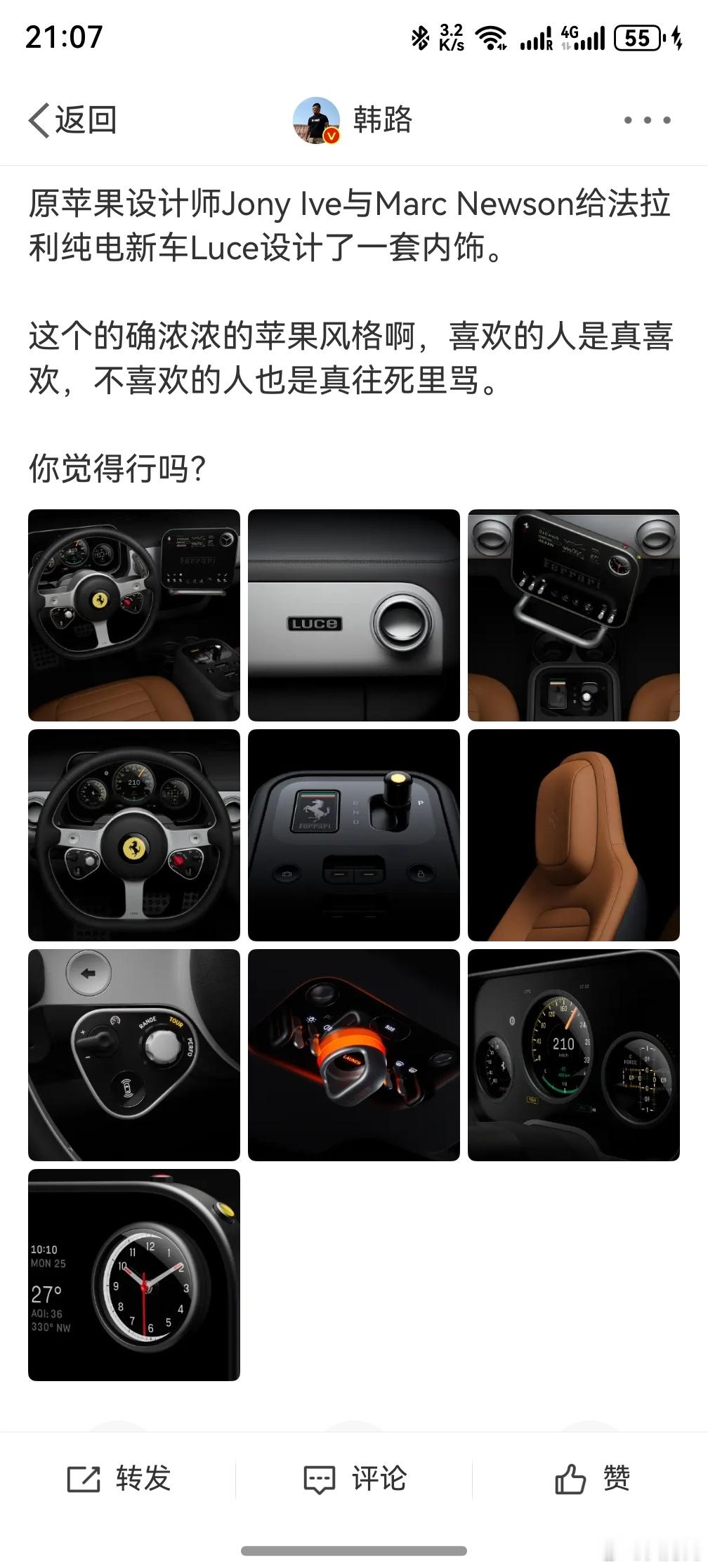 苹果设计撞上法拉利电动跑车 ,大师一旦成名了,设计的什么都是有原因的,都是有道理的,这要是一个不知名的设计师设计出来的,估计早都被骂死了。