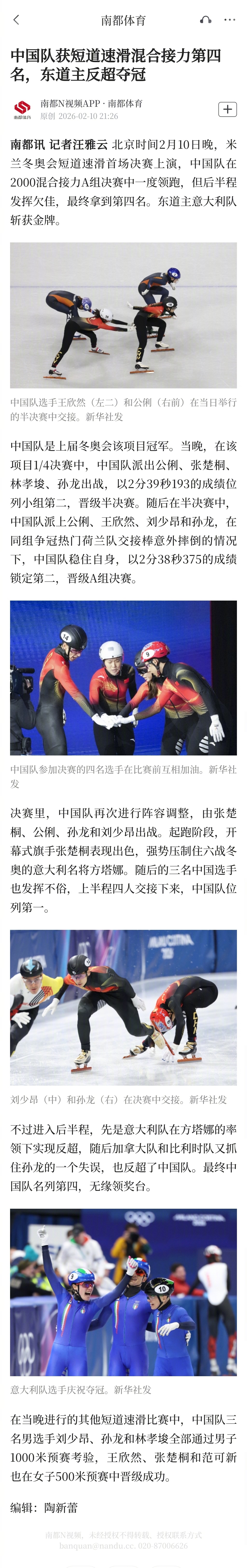 【#中国队获短道速滑混合接力第四名#,东道主反超夺冠】#中国短道混接无缘奖牌#北京时间2月10日晚,米兰冬奥会短道速滑首场决赛上演,中国队在2000混合接力A组决赛中一度领跑,但后半程发挥欠佳,最终拿到第四名。东道主意大利队斩获金牌。