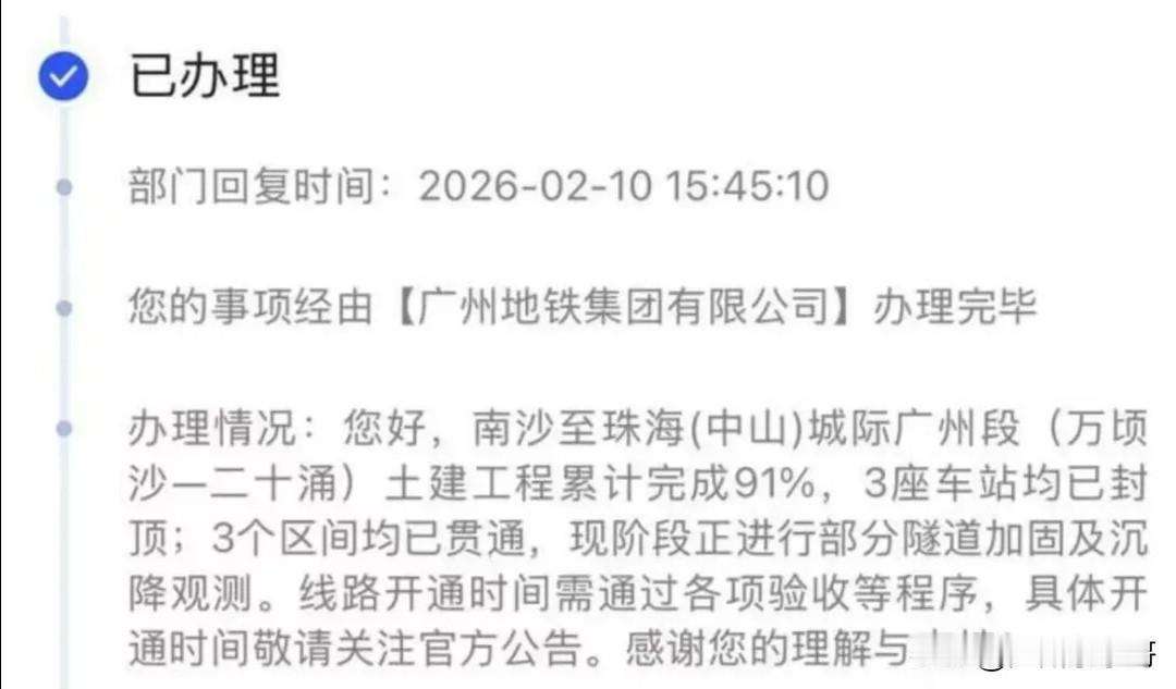 南中城际广州段进度已经完成91%,年内开通有望? 据广州地铁透露,南珠中城际广州段即万顷沙至二十涌段,3座车站均已封顶,3个区间也已贯通。表面上看是顺顺利利,通车在望。其实广州段目前还没有进入大面积铺轨阶段,面对隧道加固工程和沉降难题,就算工程还只剩下9%,广州地铁对于开通时间也是非常谨慎,具体日期确实难以预料。 好消息是广州地铁已经开始采购万顷沙至香山段铺轨用的相关材料,只要解决了沉降问题,铺轨工作也会很快展开。 不过就算完成了铺轨,后面机电安装、联调联试等工作也需要大量时间,南中城际广州段今年开通或许也来不及了,在保证安全和没有工期压力情况下,恐怕也要等到2027年了,要是等待中山段一起开通,那就更迟了,怎么也得2028年以后。