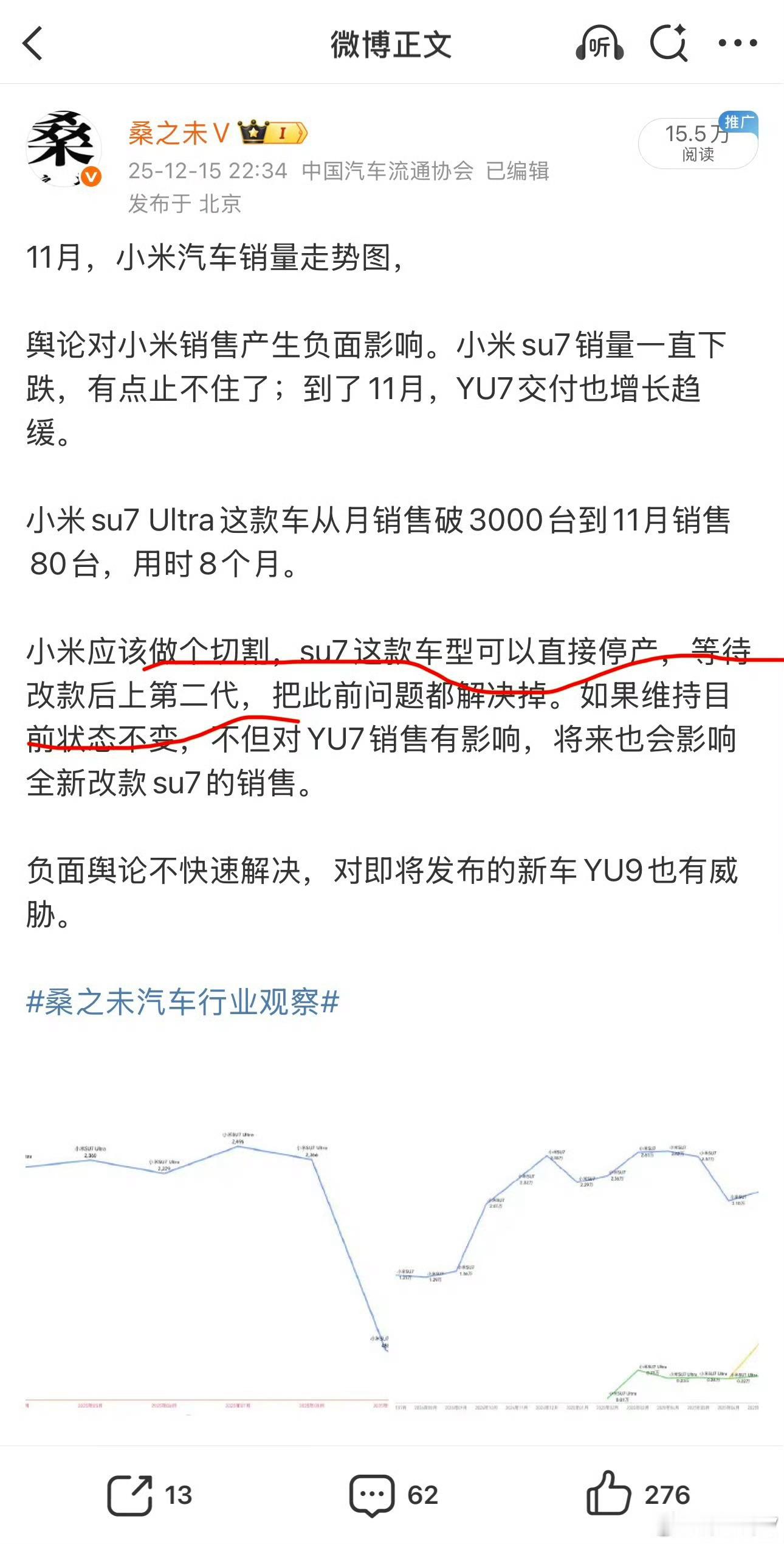 此前发过一条微博点评小米SU7,提到“小米应该做个切割,su7这款车型可以直接停产,等待改款后上第二代,把此前问题都解决掉。”(图2)