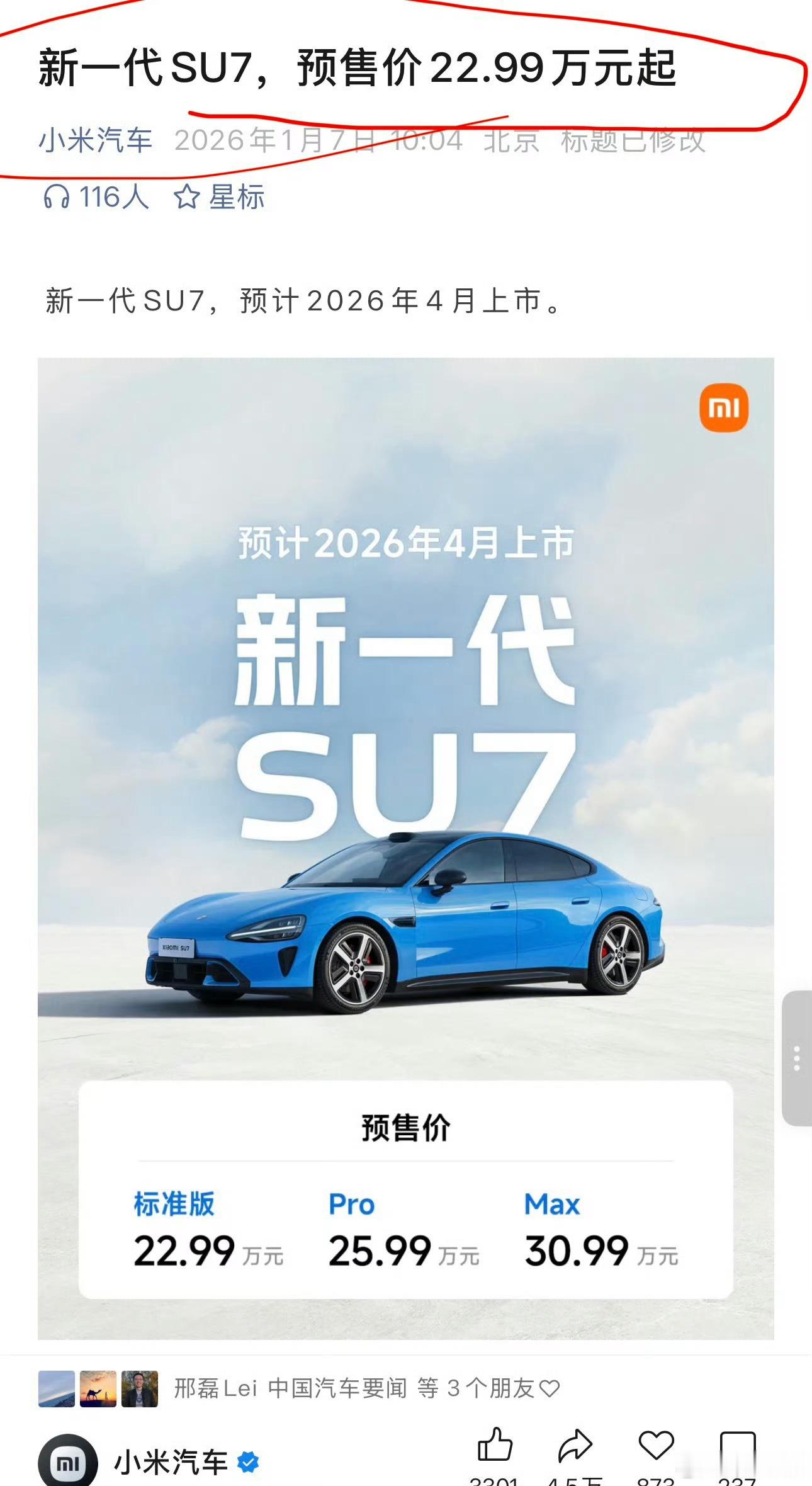 小米Su7第二代车型将于2026年4月(北京车展也在4月举办)上市。
