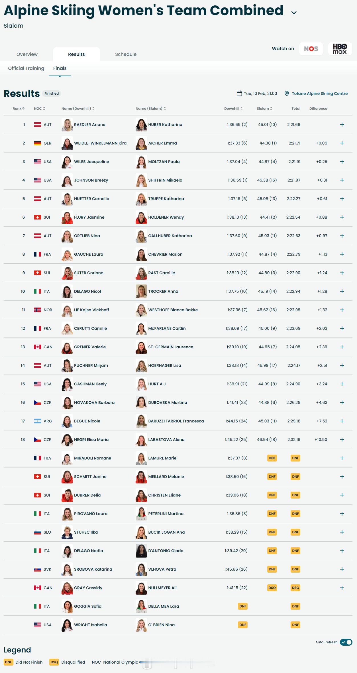 【冬奥高山滑雪女子全能团体奥地利夺冠】冬奥会 2月10日,冬奥会高山滑雪女子全能团体比赛结束,奥地利拉德勒/胡贝尔以2分21秒66夺得金牌,德国魏德勒/埃切尔落后0.05秒惜败摘银,美国维尔斯/摩尔赞获得铜牌。