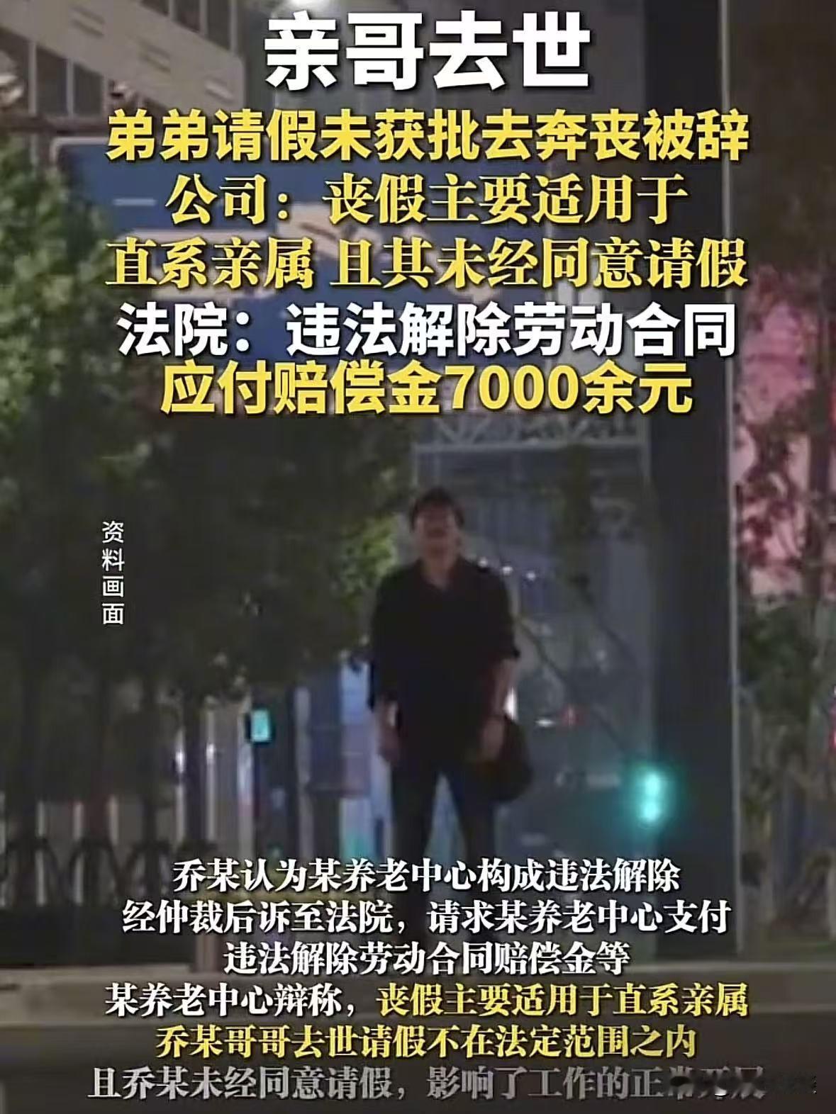 太没有人情味了!北京,男子亲哥病危,想跟经理请假回去看看,经理表示批不了,谁知刚说完这事,第二天晚上哥哥就去世,男子来不及,就给经理发信息当天晚上就得回老家,五天之后,男子处理完哥哥的后事,给经理发信息表示自己回来上班,谁知经理告诉男子:擅自离岗,不用来了,下周一找我写辞职信,男子懵了,一气之下把公司给告了,说公司违法解除劳动合同,要求支付赔偿金。公司:丧假适用于直系亲属,男子哥哥去世请假不在范围之内!法院最后这样判了! 乔某是一位普通的打工人,2023年4月份的时候,在一家养老中心当厨师。 乔某很珍惜这份工作,勤勤恳恳,平时不迟到不早退,老老实实干活。 谁知道,几个月后,同年8月19日,家里突然传来消息,亲哥哥病危。 乔某一听,那是血脉相连的亲哥,就想赶回去见最后一面。 可手里的工作,不敢随便丢,他心里又急又慌,第一时间找到后厨经理高某。 告诉他我哥病危,可能快不行了,我想请半个月假,回去看看。 高某一听就拒绝了,意思批不了那么久,乔某还商量不行不带薪休假也可以,给假就行。 乔某心里急的不行,这是亲哥,万一没赶上最后一面,这辈子都遗憾。 他心里祈祷,盼着哥哥在撑一撑,能撑到自己请好假。 结果怕什么来什么,头天刚请假被拒,第二天晚上,家里就来电话:哥哥没了,人走了! 乔某当时就崩溃了,想见最后一面都没赶上,连哥哥最后一程都送不了,当弟弟的,心里别提多痛多愧疚。 他顾不上跟经理再磨叽,赶紧发信息跟经理说:高经理,我原本想在晚两天请假,但是现在来不及了,我哥没了,我必须马上回老家,丧事办完就回来。 随后,乔某收拾东西,连夜往家赶。 到家以后,乔某伤心欲绝,但是现在只能接受现实。 他强忍悲伤,给哥哥办身后事,,里里外外,前前后后折腾了五天。 终于把哥哥的后事料理妥当后,心里还惦记着工作,怕耽误单位事,一完事就赶紧往回赶。 路上,乔某第一时间给经理发信息,说自己处理完家事了,准备回来上班。 谁知道经理高某回了一句话,直接给乔某整懵了。 高某回复:下周一找我,写辞职信,明天不用来公司。 乔某当时脑子嗡的一下,一片空白,他想不明白,哥哥病危请假你不批,等人没了自己赶回去奔丧,就因为这给我辞退了? 乔某不理解,也不接受这个说法,自己工作以来从没旷过工、也没偷过懒。 如今是家里出了人命大事,是单位不近人情不批假,现在反倒把错全推到他身上,还要开除他。 这口气,换谁也咽不下,他也懒得跟单位废话,直接把公司告了。 理由很简单,他认为单位构成违法解除,要求其支付违法解除劳动合同赔偿金。 单位得知高某把他们给告了,辩解称:丧假只适用于直系亲属。 乔某哥哥去世,不在丧假范围里,你没经过批准就离岗,就是旷工,开除你没毛病。 亲哥不是直系亲属?一母同胞的兄弟,病危、去世,连请假奔丧的资格都没有? 就算有什么明文规定,那规定是死的,人是活的,难道就一点人情味都不讲吗? 没想到,最后法院的判决,真的太解气了! 《劳动合同法》第3条:订立劳动合同,应当遵循合法、公平、平等自愿、协商一致、诚实信用的原则。 这是“善意、宽容、情理”的源头,要求用人单位不得滥用解除权。 而乔某亲哥哥病危、去世,属于人伦大事、紧急事由,员工返乡奔丧,符合公序良俗和传统孝道,合情合理合法。 单位明知员工家中有丧事,不仅不批假,还以“擅自离岗”开除,违背人情伦理,也不符合法律精神。 就算兄弟姐妹不在法定带薪丧假范围内,单位也应该批准合理的事假,不能一刀切拒绝,更不能以此开除员工。 最终法院判决:该单位构成违法解除劳动合同,应向乔某支付违法解除劳动合同赔偿金7000余元。 这一判决真是让人拍手称快,这不只是维护了一名打工人的权益,更是守住了社会最朴素的正义观。 不得不说,制度是死的,但人是活的,单位可以讲规矩,但不能没人性。 请假奔丧,是为人的底线,批假体谅,是单位的理解与包容。 要知道规章制度从来不是用来刁难普通人的工具,单位对员工多一分理解,才能走得更远,也才配得上员工的忠诚与付出。 对此,你怎么看这件事! @静心法谈 学法辨是非,慬法不吃亏。