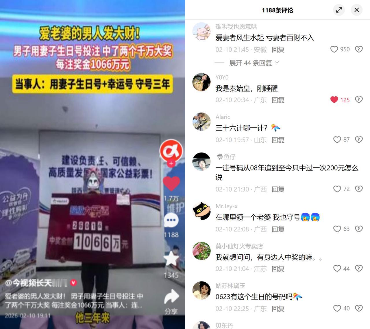 守妻生日号中千万 最近这事儿传得热,但细扒下来有不少疑点,号码里混着超出生日范围的数字,连对应的开奖期号都对不上,更像个精心包装的故事。 这套路早就不新鲜。不少彩票宣传总爱用温情人设+坚持守号的组合拳:一边用爱妻、孝心这类软标签拉近距离,消解大家对极低中奖概率的理性警惕;一边靠个别幸存者案例,制造坚持就有回报的幻觉,让不少人抱着侥幸持续投入。 说白了,就是把原本的公益属性,悄悄包装成了情感励志+一夜暴富的爽文,精准拿捏了普通人的共情点和暴富梦。留言里满是调侃,大伙心里都门儿清:比起冰冷的概率,谁不想信好人有好报的童话呢?