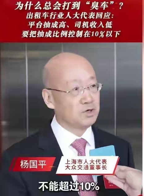 上海人大代表:建议平台抽成10%以下!近日,上海人大代表杨国平提出,目前出租车行业平台抽成高,司机收入低,要把平台抽成控制在10%以下,这样的说法一下子就引发了众多媒体和网友的关注。