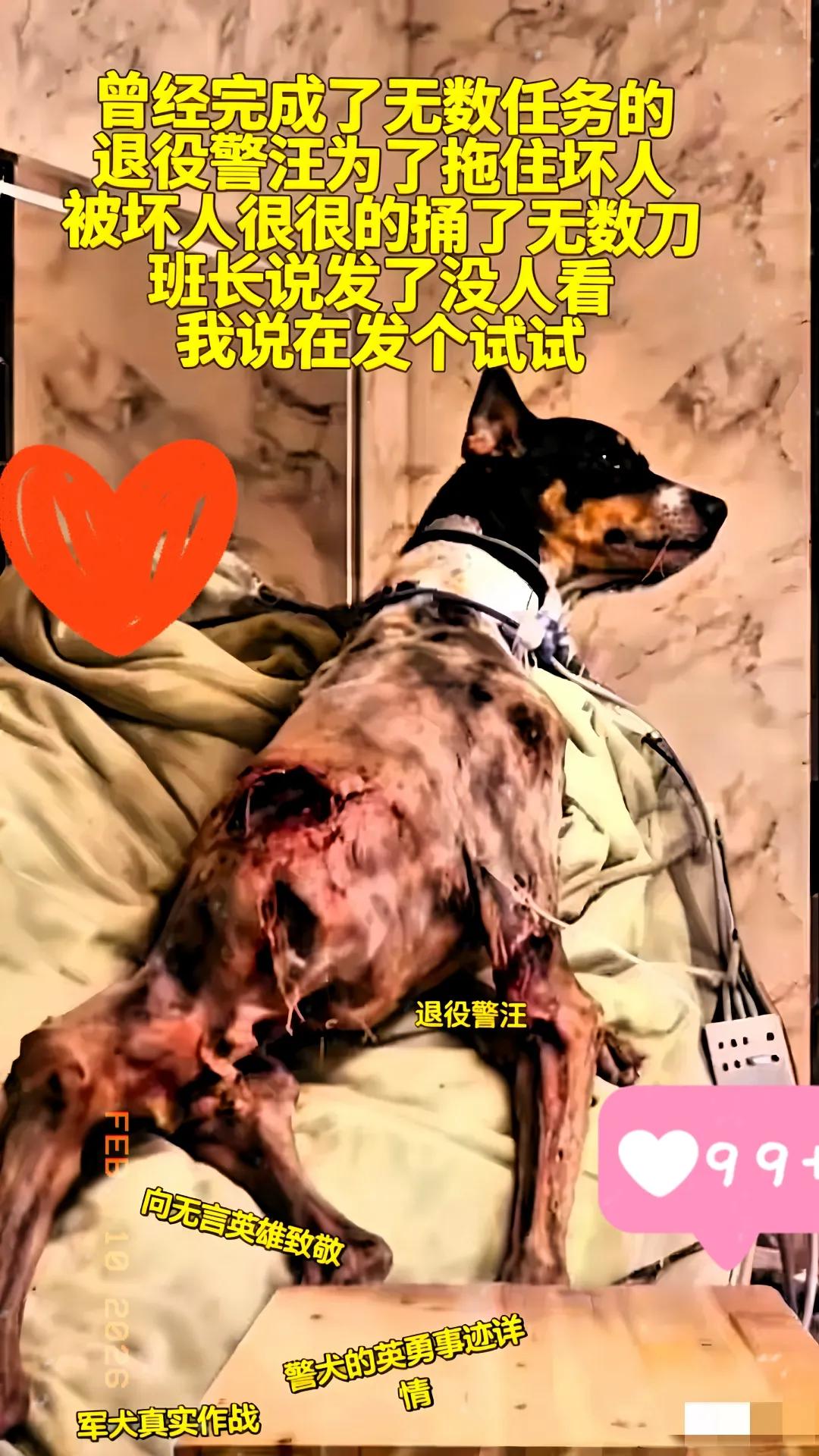 很多人在网上看到可爱的宠物照片,都会不由自主地点个赞,但要是看到保护我们的警犬照片却总是划走,这里就有一个不解的谜团:这只退役警犬,曾在危急时刻,毫不犹豫地冲上前去,咬住坏人。即使被坏人捅伤了,也不肯松口,用它的生命换来大家的安全。它没有语言,它不争功名,可它用忠诚守护正义。它默默奉献,不求回报。为什么人们却总是忽视它?难道只喜欢那些卖萌的小家伙,而不喜欢那些为人类奉献一生的英雄?是的,它没有华丽的外表,没有惊天动地的事迹,没有金光闪闪的奖牌,却用一生守护大家的安全。我们为什么不多多点赞,多多关注这些英雄呢?它们都是奉献自己的生命,换取大家平安的人,我们理应尊重它们,关注它们。致敬所有警犬、军犬,它们都是无冕英雄,不该被遗忘! 有网友说,这退役警犬太让人泪目了!拼了命护着大家,忠诚刻在骨子里,这才是真英雄啊!别再冷落这些无 言战士,它们值得所有点赞和敬意! 忠诚刻进骨血,无畏护佑人间,这只退役警犬的模样,看一次心疼一次也敬佩一次!它从没想过邀功,只是刻在本能里的守护,在危险来临时依旧挺身而出,刀伤再痛也不肯松口,用身躯筑起 防线,换来了旁人的平安。