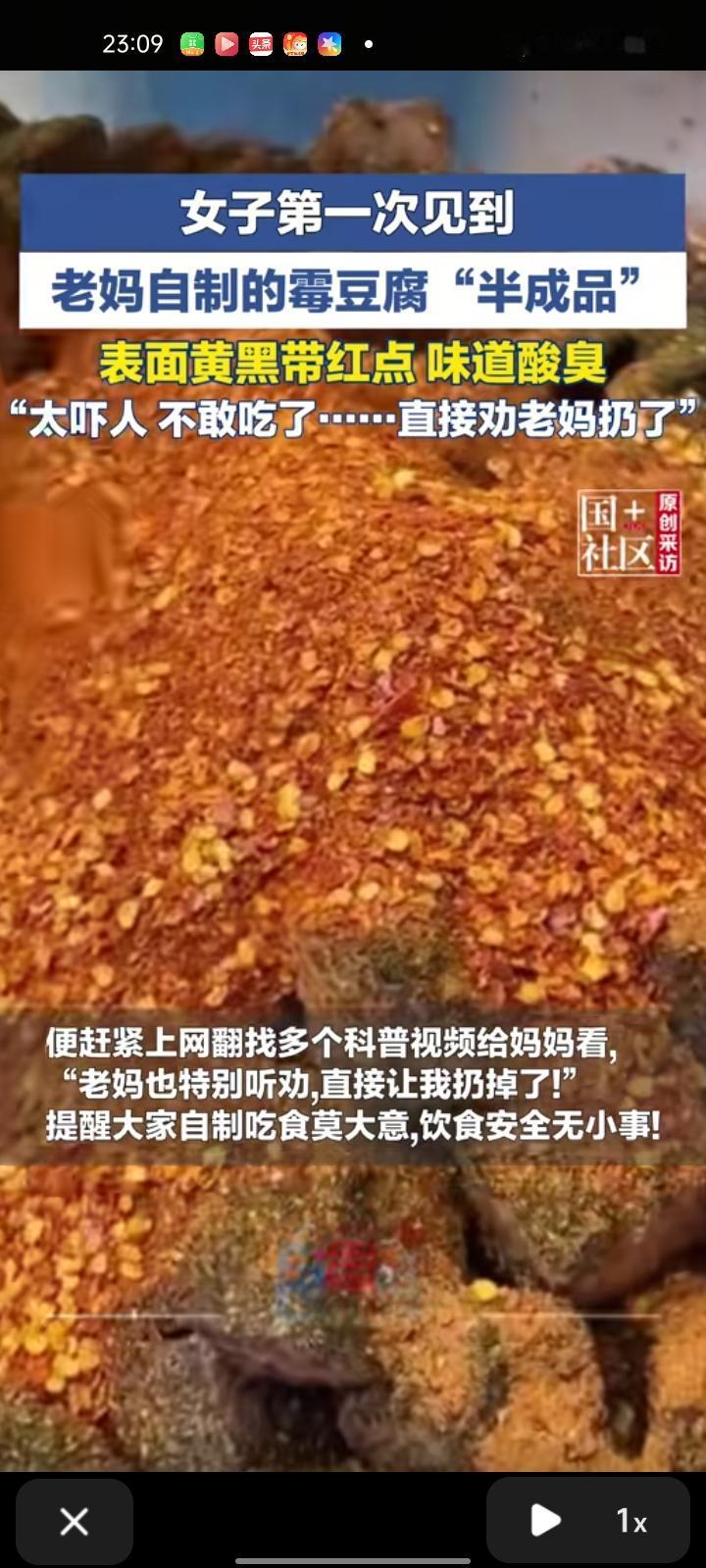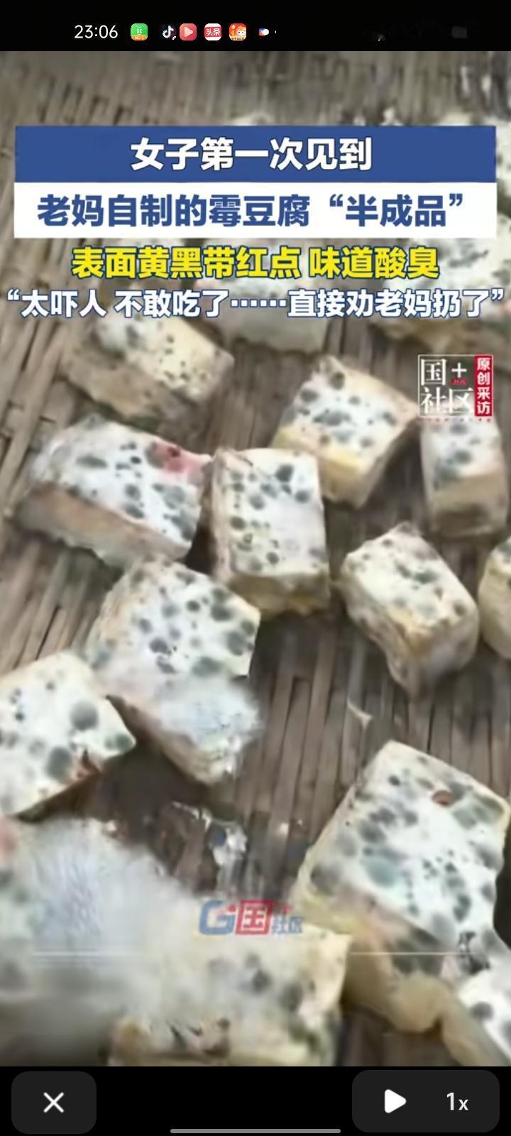 2月6日,昭通市绥江县。女子发视频展示妈妈自制的霉豆腐“半成品”,豆腐发酵了几天,表面黄黑带有红点,闻着酸臭,看着就不对劲。便赶紧上网翻找多个科普视频给妈妈看,妈妈很挺全,直接把豆腐扔掉了,要是吃了这种豆腐不知道会有什么后果