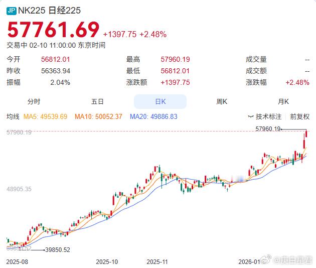 在这一轮选举中,自民党获得了超过315个席位,超过总席次的三分之二,这一议席比例为日本战后选举中任何政党的最高水平。日本众议院一共有465个席位,如果想获得执政的地位,就需要获得最少233个席次。如果想修宪,就需要拥有310个以上的席次。高市赌赢了,也让市场对她推动的经济刺激政策也有了更清晰的推进路径,对日经指数而言,这无疑是天大的利好消息。在“高市交易”推动下,日本股市连涨三日,后市还有望继续大涨,冲击60000点。