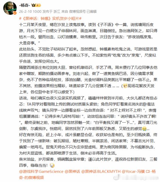 杨奇发文谈《黑神话:钟馗》首个实机游戏科学的最新作《黑神话:钟馗》发布了首支实机短片。视频发布的同时,游戏科学联合创始人兼美术总监杨奇也发文提到了这支实机贺岁小短片。他表示,如果直接把传统民俗神话中“钟馗吃鬼”的生吞活剥做进游戏有些难以下手,因此改成了“烹鬼”,这样也更好发挥。在这支实机视频时,他坦言游戏科学已经很久没有录制类似的视频了,“磕磕绊绊做到半月前,大伙儿都还有些忐忑”。甚至给了他6年前《黑神话:悟空》初公布时那“又熟悉,又陌生的感觉”。不过好在有惊无险终于赶上了发布,“成片虽略显仓促,收获却也是有的”。此外,他还表示:“谨以此片贺岁,遥祝各位新朋旧友,三餐四季,稳稳当当!”游戏科学拜个早年,《黑神话:钟馗》6分钟实机小短片