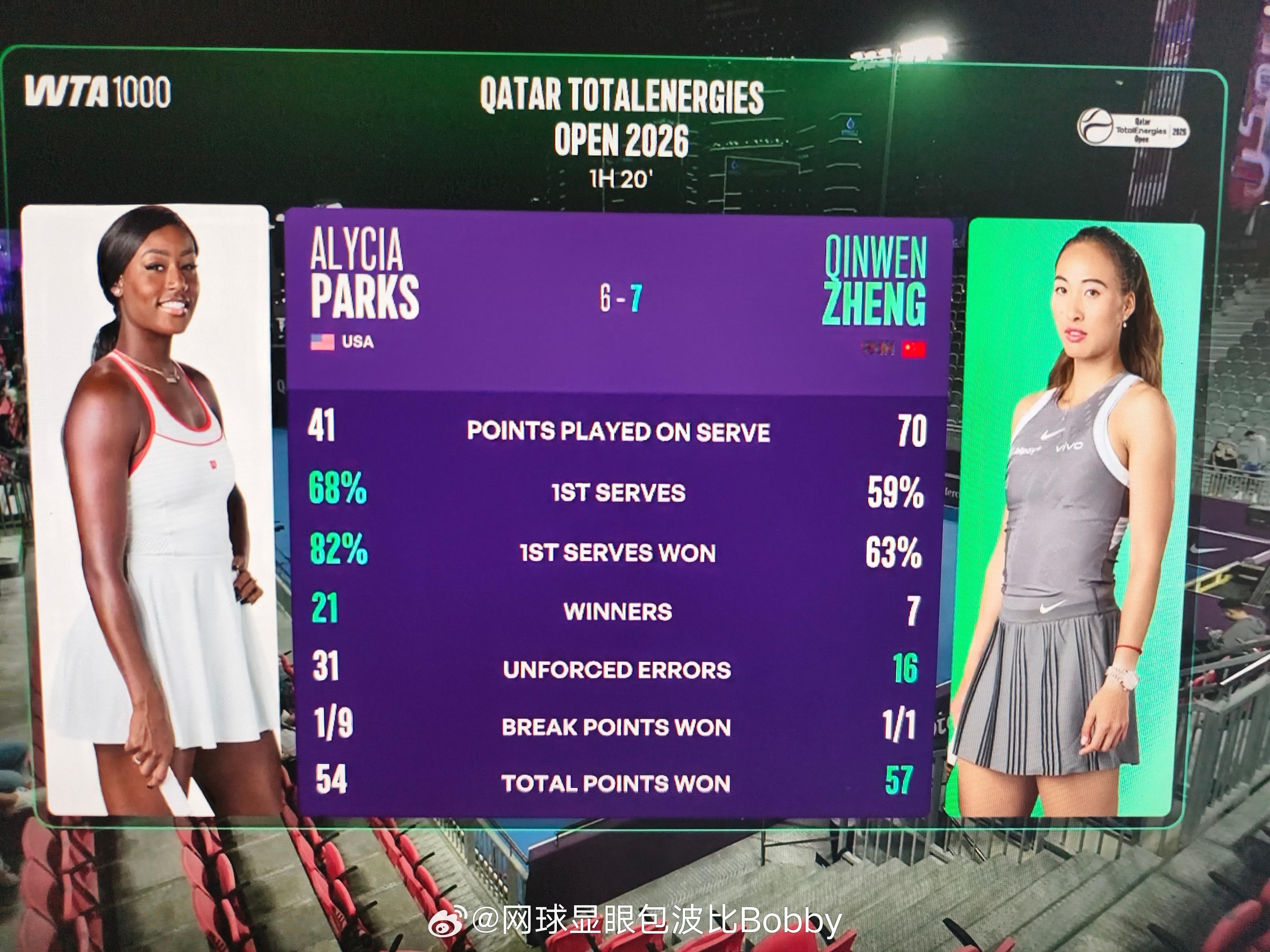 第一盘技术统计:郑钦文发球还得提一提,不然第一盘也不会这么难,帕克斯超高的一发得分率。制胜分21比郑钦文多。但是ue也是高达31