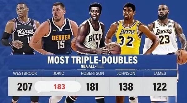 又又又拿三双了,约基奇最快本赛季就能加冕历史三双王掘金2分憾负骑士,约基奇表现依旧亮眼,全场拿到22分14篮板11助攻,这样他的三双数量就来到了183次,距离威少只差24场。本赛季常规赛还剩下28场,理论上约基奇有机会在本赛季就能超越威少成为历史三双王。历史前五三双数量:1、拉塞尔-威斯布鲁克 2072、尼古拉-约基奇 1833、奥斯卡-罗伯特森 1814、魔术师-约翰逊 1385、勒布朗-詹姆斯 122nba掘金约基奇