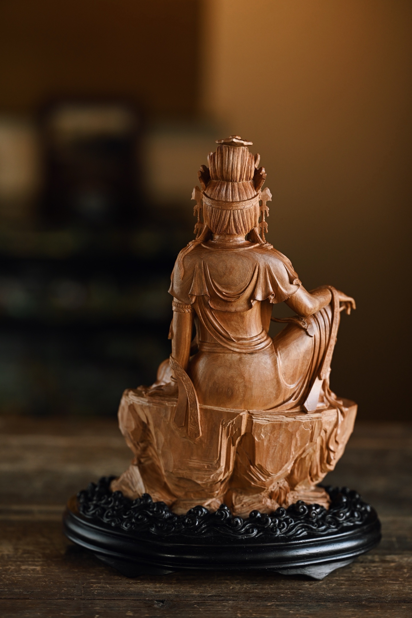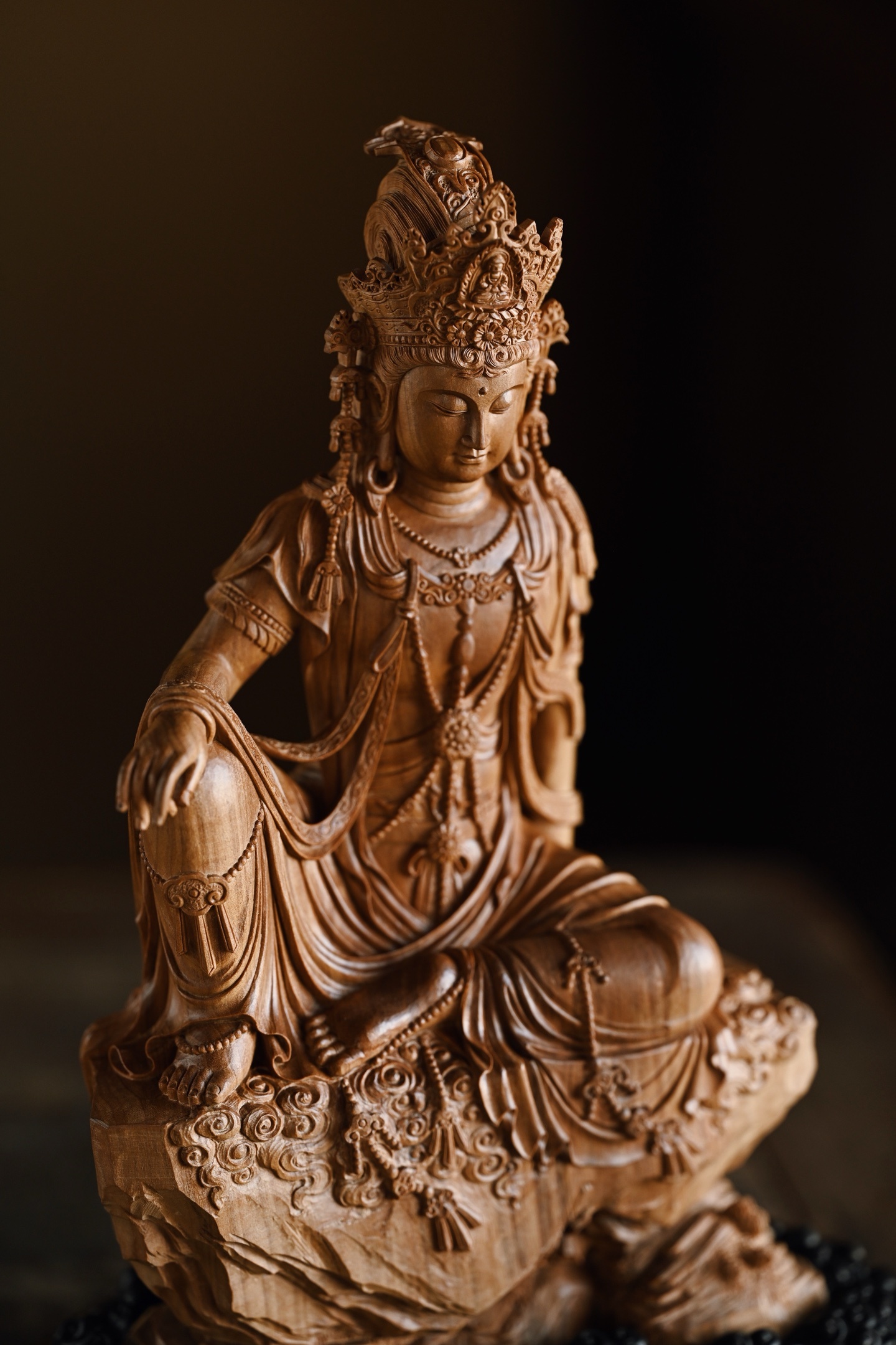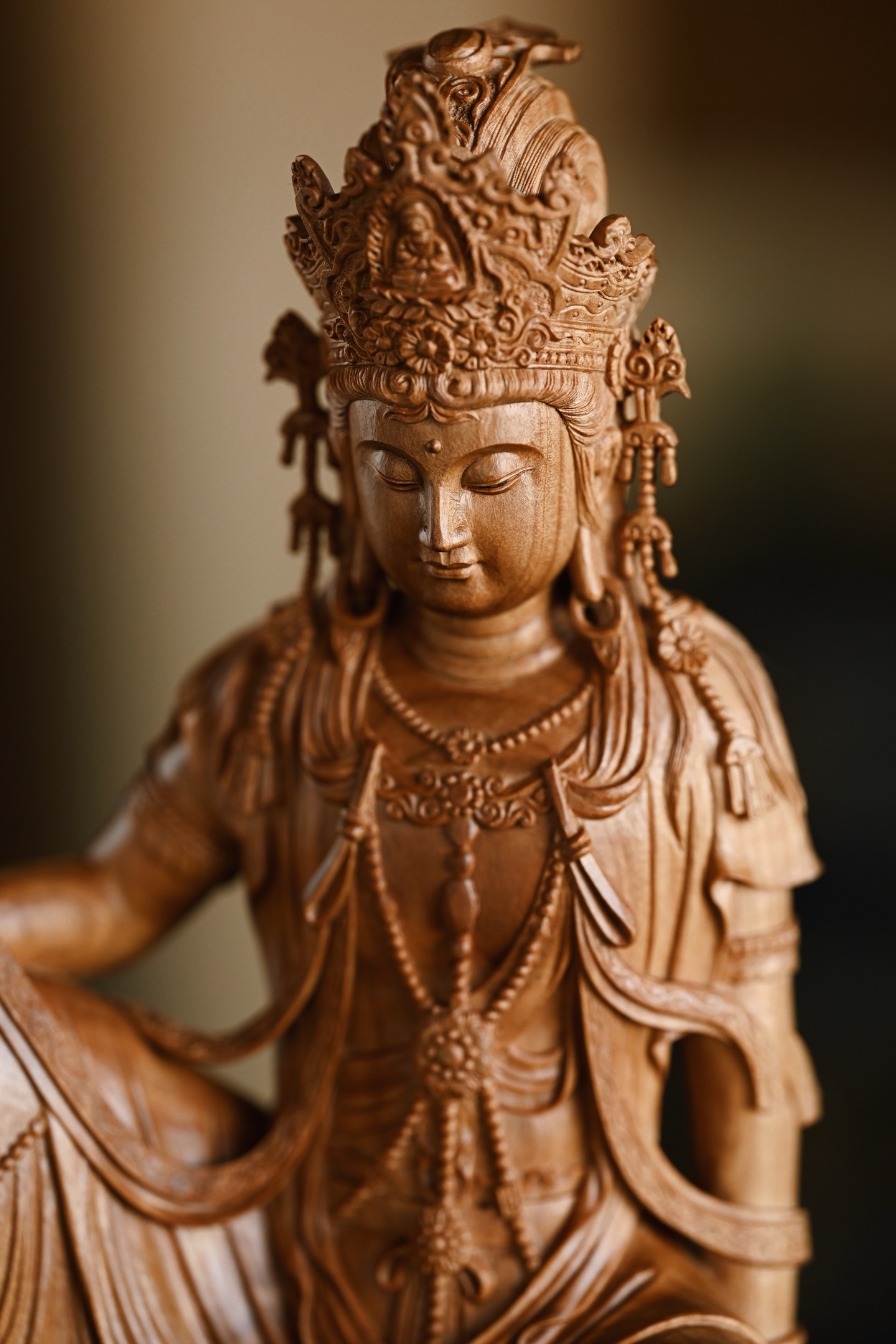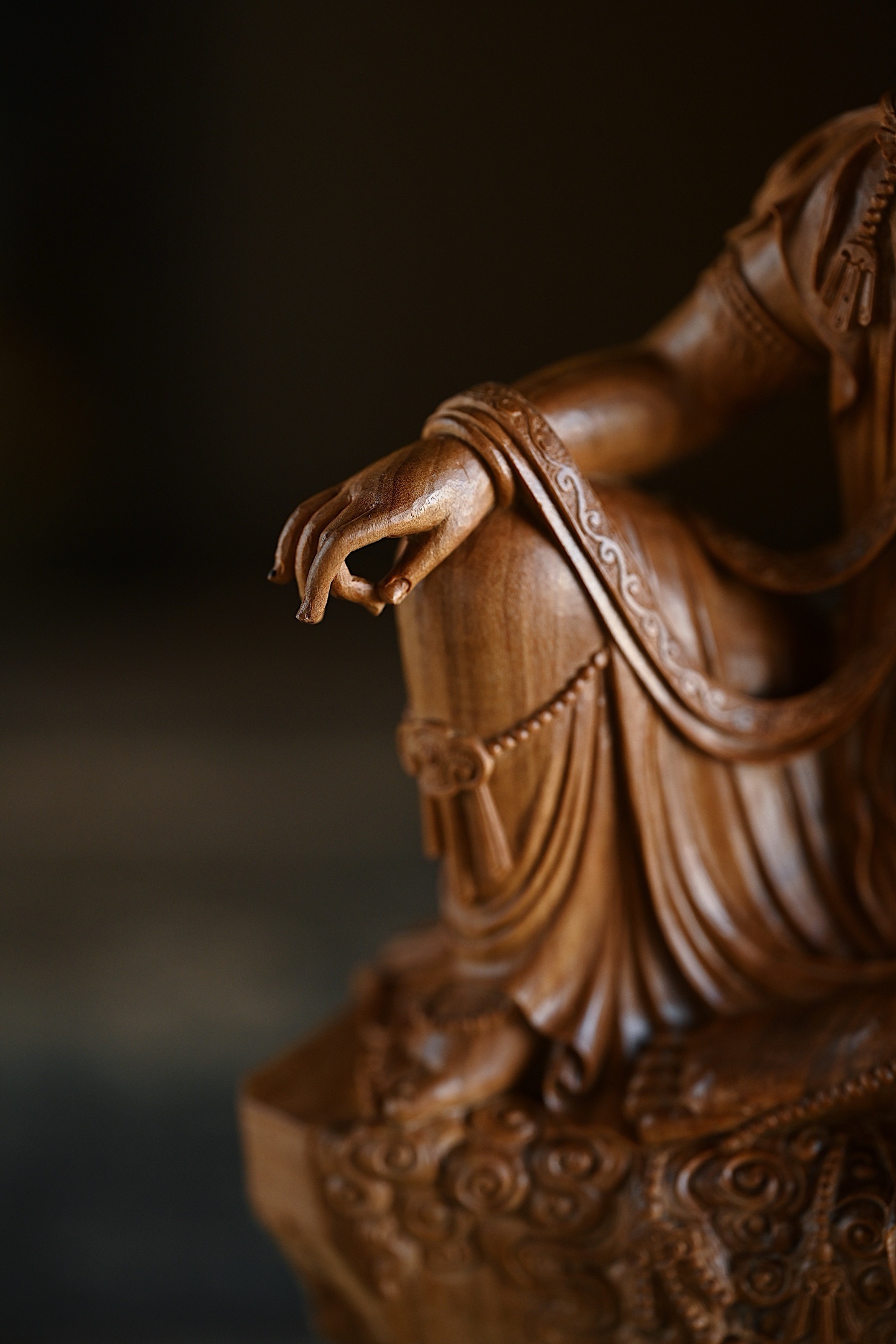整料雕刻,料色清雅,观音开脸柔美传神,自在而坐,气韵清逸脱俗,垂眸静观众生,身姿柔美,慈悲庄严。