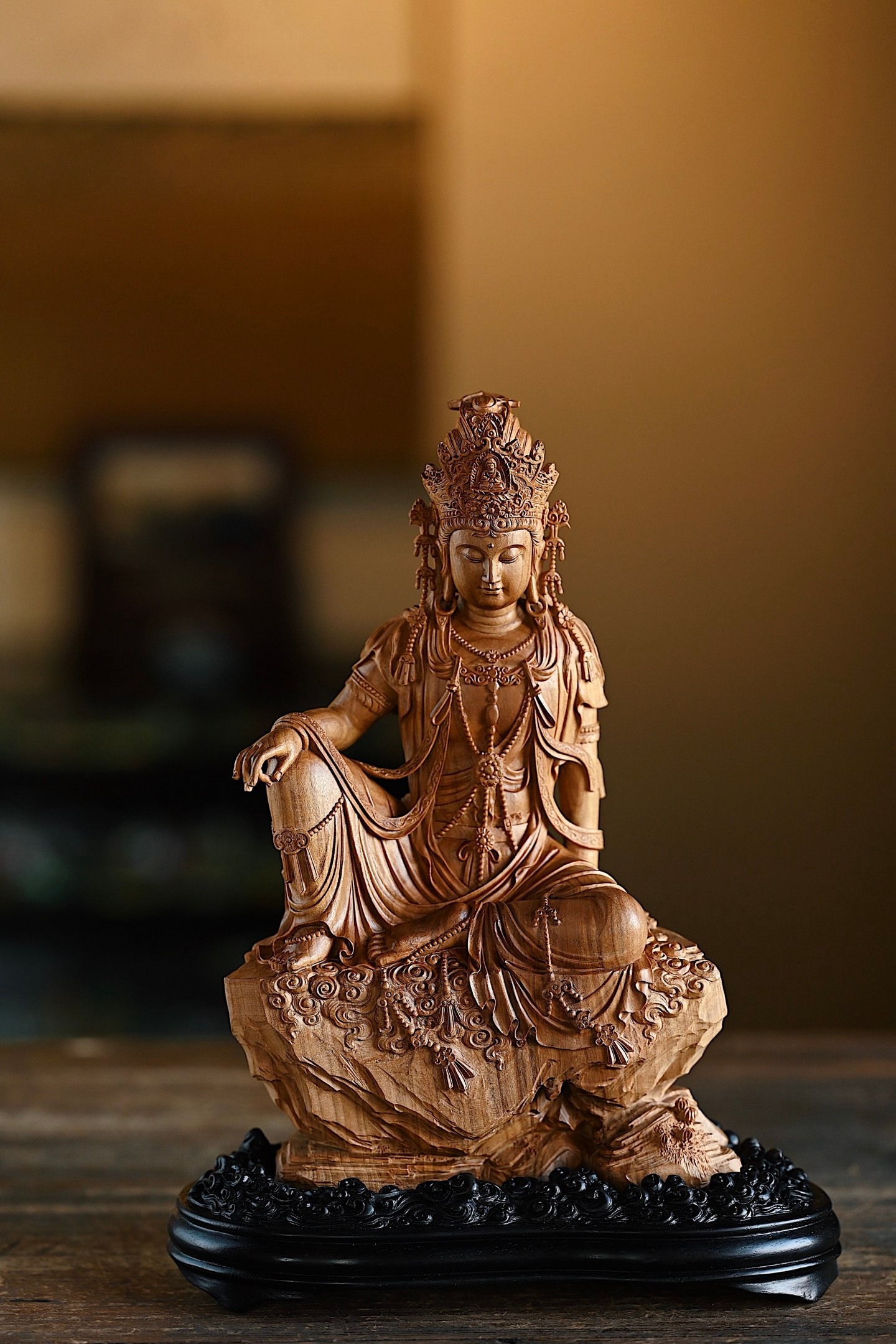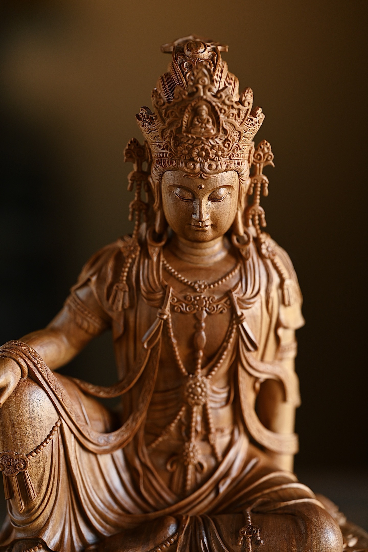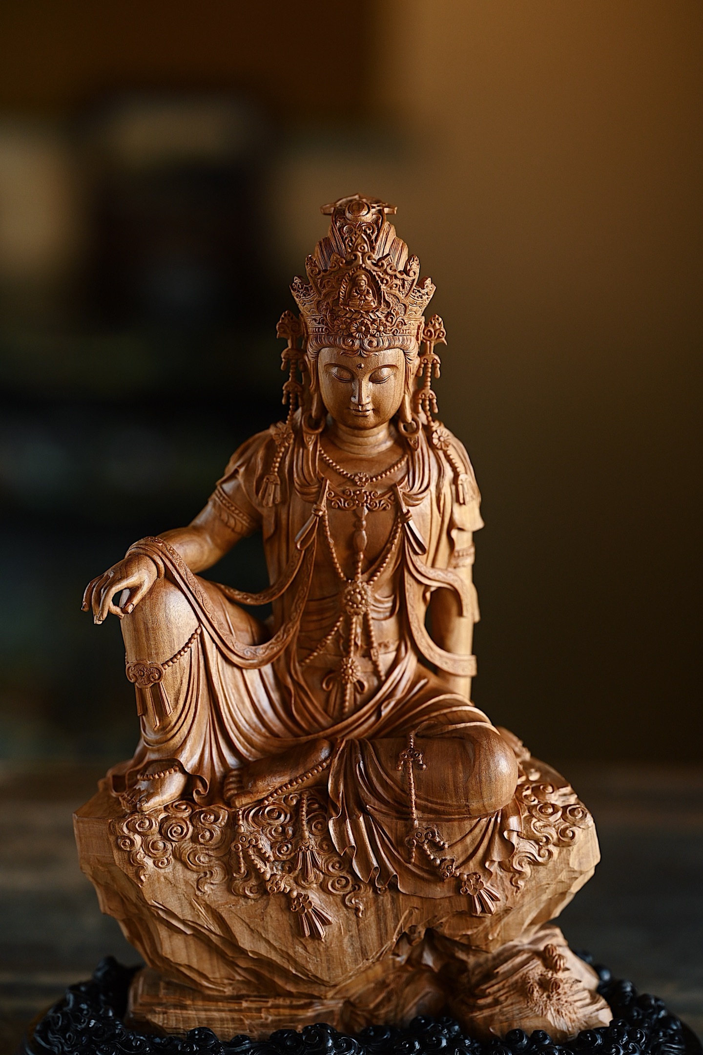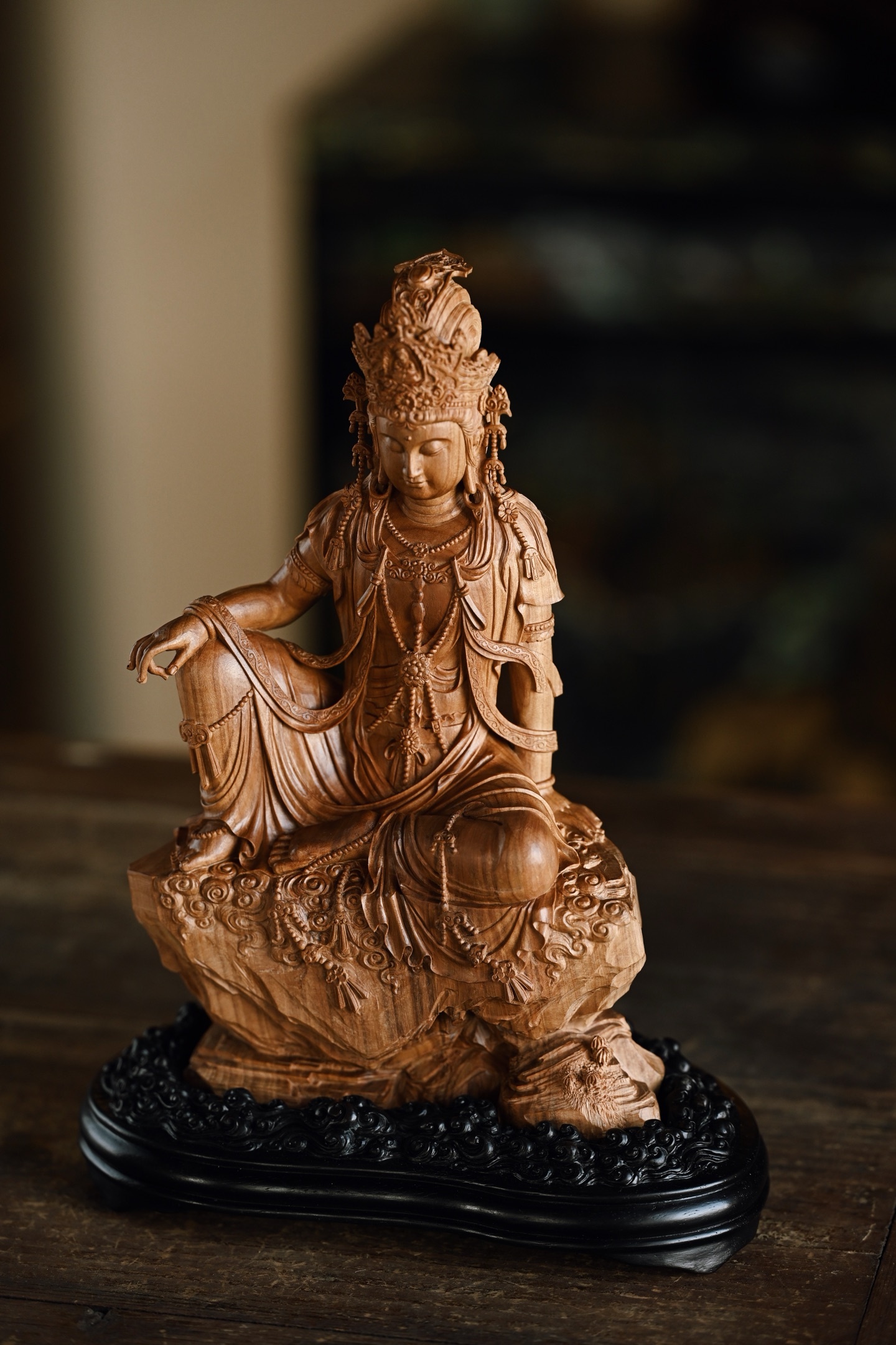 整料雕刻,料色清雅,观音开脸柔美传神,自在而坐,气韵清逸脱俗,垂眸静观众生,身姿柔美,慈悲庄严。