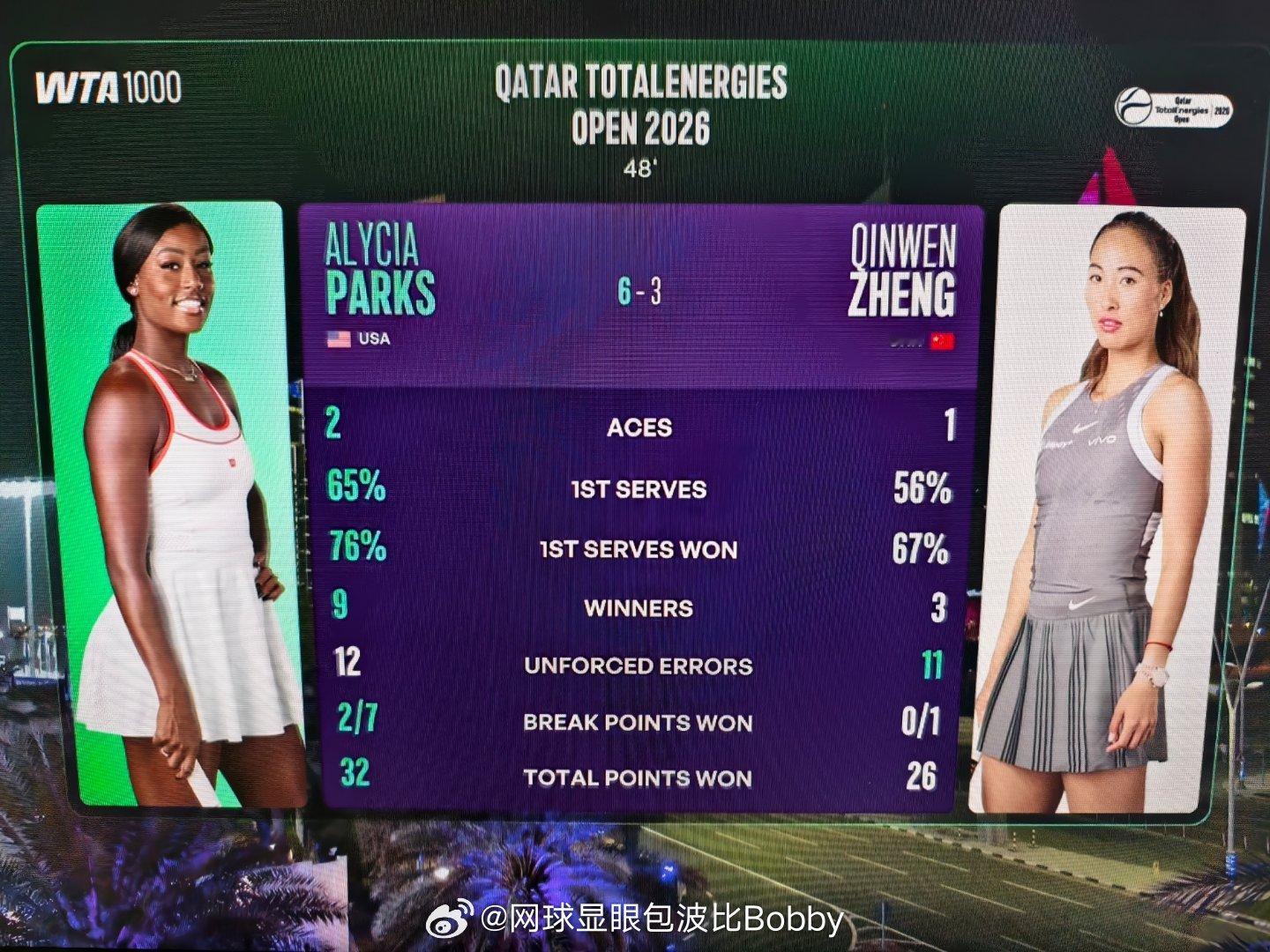 第一盘技术统计:郑钦文发球还得提一提,不然第一盘也不会这么难,帕克斯超高的一发得