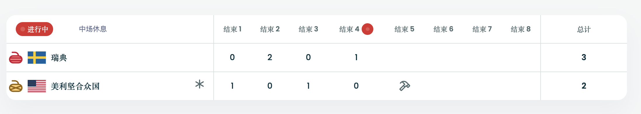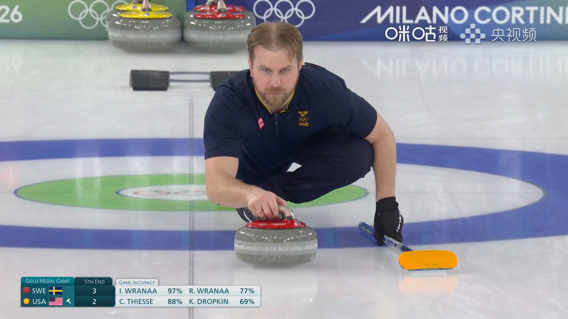 🥌米兰冬奥会冰壶混双决赛,美国对阵瑞典,赛程过半,瑞典队在第二局后手拿到2分,目前瑞典3-2 暂时领先。