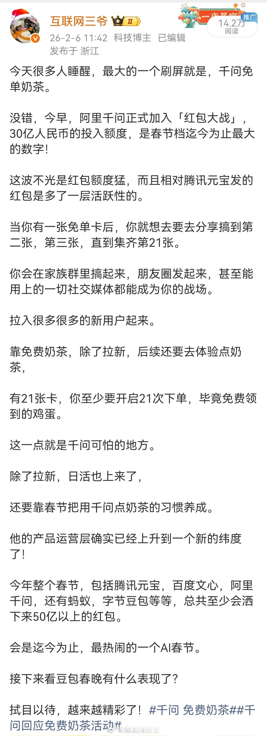 春节AI红包大战哪家强HOW I AI过个有AI年上周聊到过这个问题,现在整体上AI共发红包接近50亿了,腾讯元宝、阿里千问、字节豆包、百度文心,纷纷下场砸真金白银抢先AI应用入口啊,当然目前局面来看千问领先多个身位,无论是力度还是对用户的刺激,这波红包对千问的日活以及对千问的体验习惯相对来讲更有价值! A股春节红包密集来临