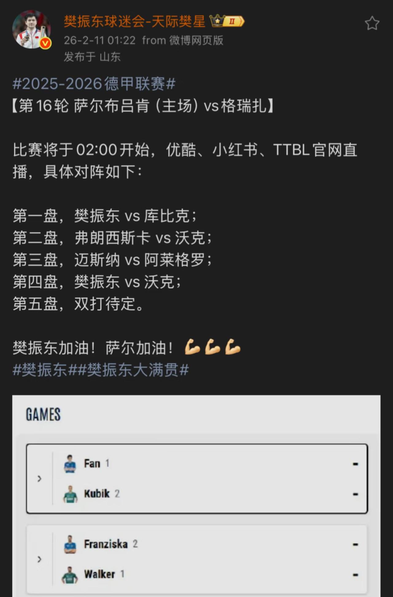2月11日樊振东一单3:1库比克——今天是黑色战袍的东哥完美拿下 11:7,7:11,11:8,11:9 樊振东一单完美拿下, 穿黑色比赛服的樊振东一样 精神抖擞, 顺利拿下比赛,尽管对手人高马大, 局局都在打鸡血式搏杀, 樊振东还是保持冷静, 采取有效战术,顺利拿下对手! 第二盘,弗朗西斯卡3:1沃克 12:10,11:6,8:11,11:8 喜欢看樊振东的比赛, 喜欢看东哥的一举一动, 千万别打到第四盘了, 萨尔加油!