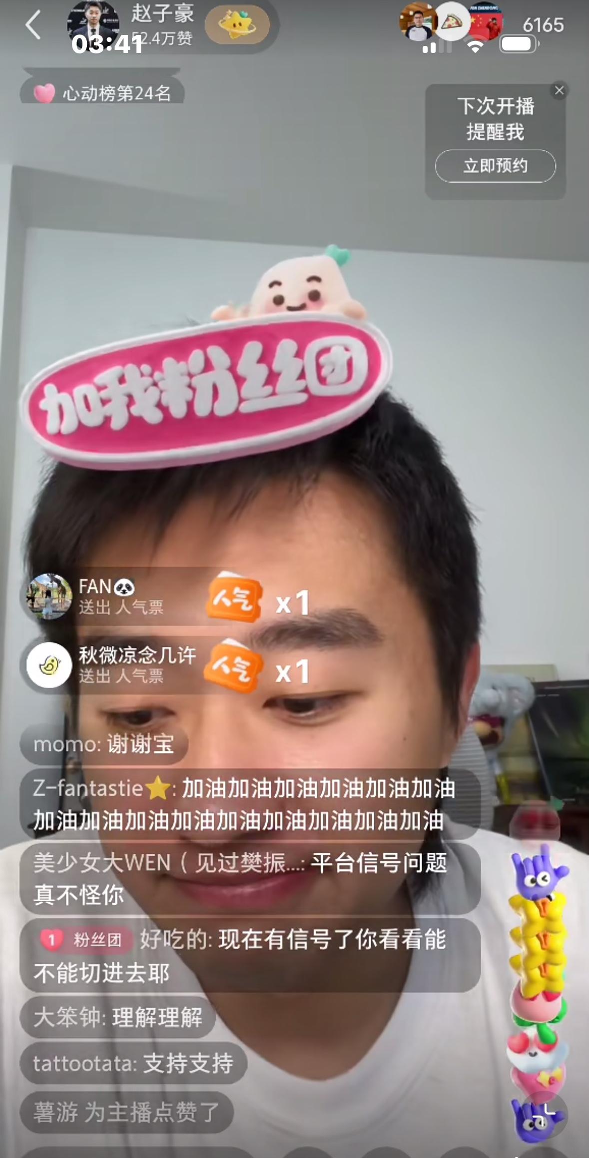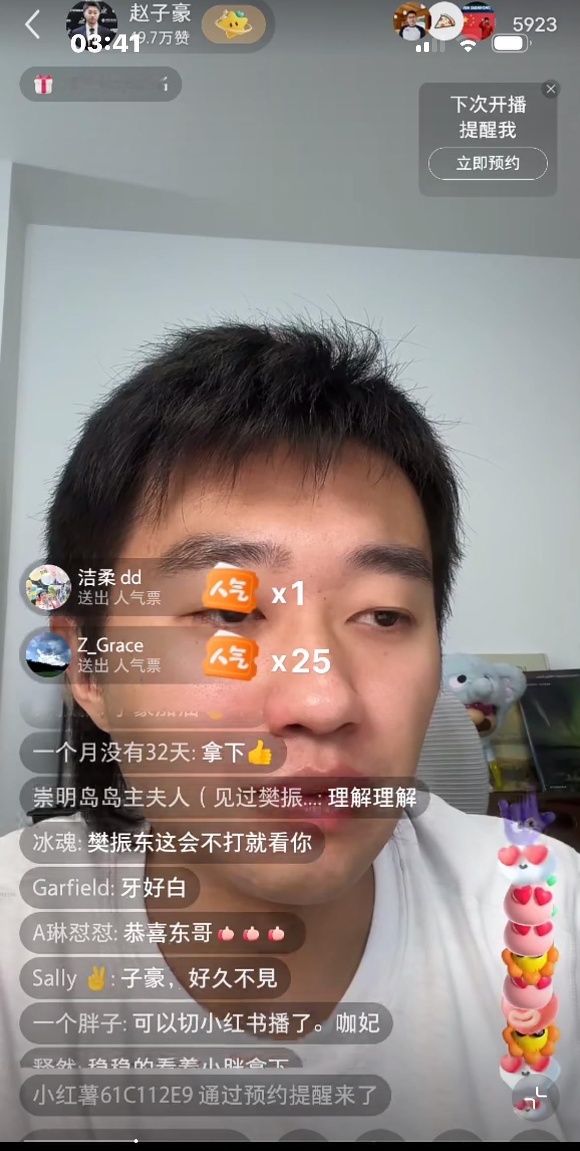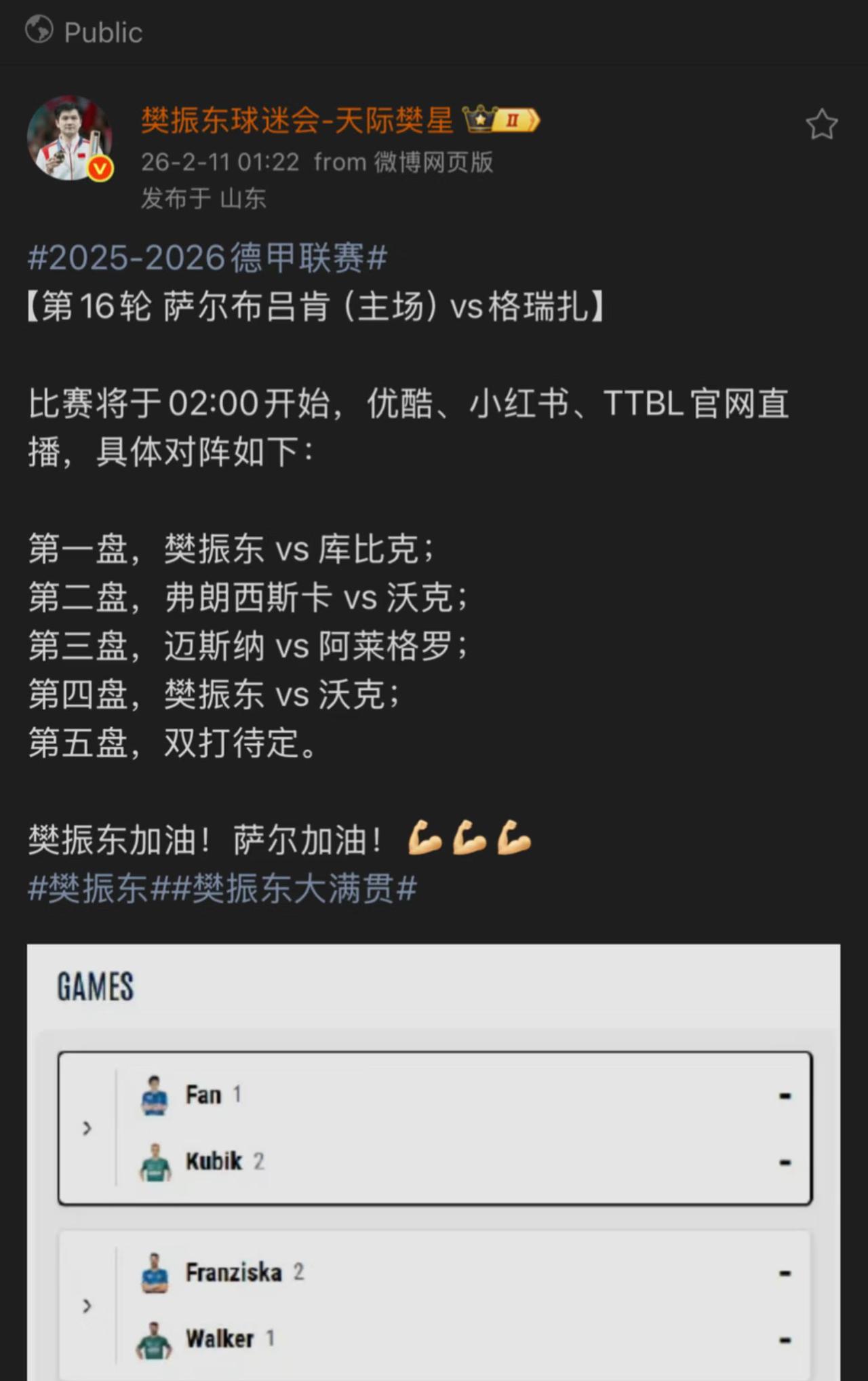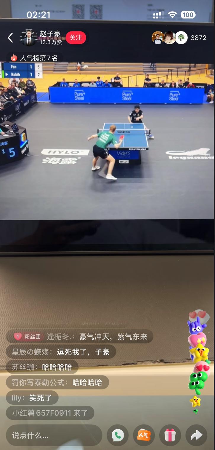 特别真诚的赵子豪很用心的准备直播樊振东的德甲! 2月11日凌晨两点, 赵子豪在直播间解说樊振东的德甲比赛,看的出来, 赵子豪准备的非常充分, 解说好朋友的比赛, 也是第一次以这种形式直播, 直播间的人数迅速攀升至万人, 平台信号不好, 赵子豪挺自责, 准备了好久, 其实是平台的问题, 基本所有直播间都不行, 幸亏信号一会儿恢复, 听赵子豪的解说很棒, 支持赵子豪! 樊振东一单,第一盘3:1完美拿下!