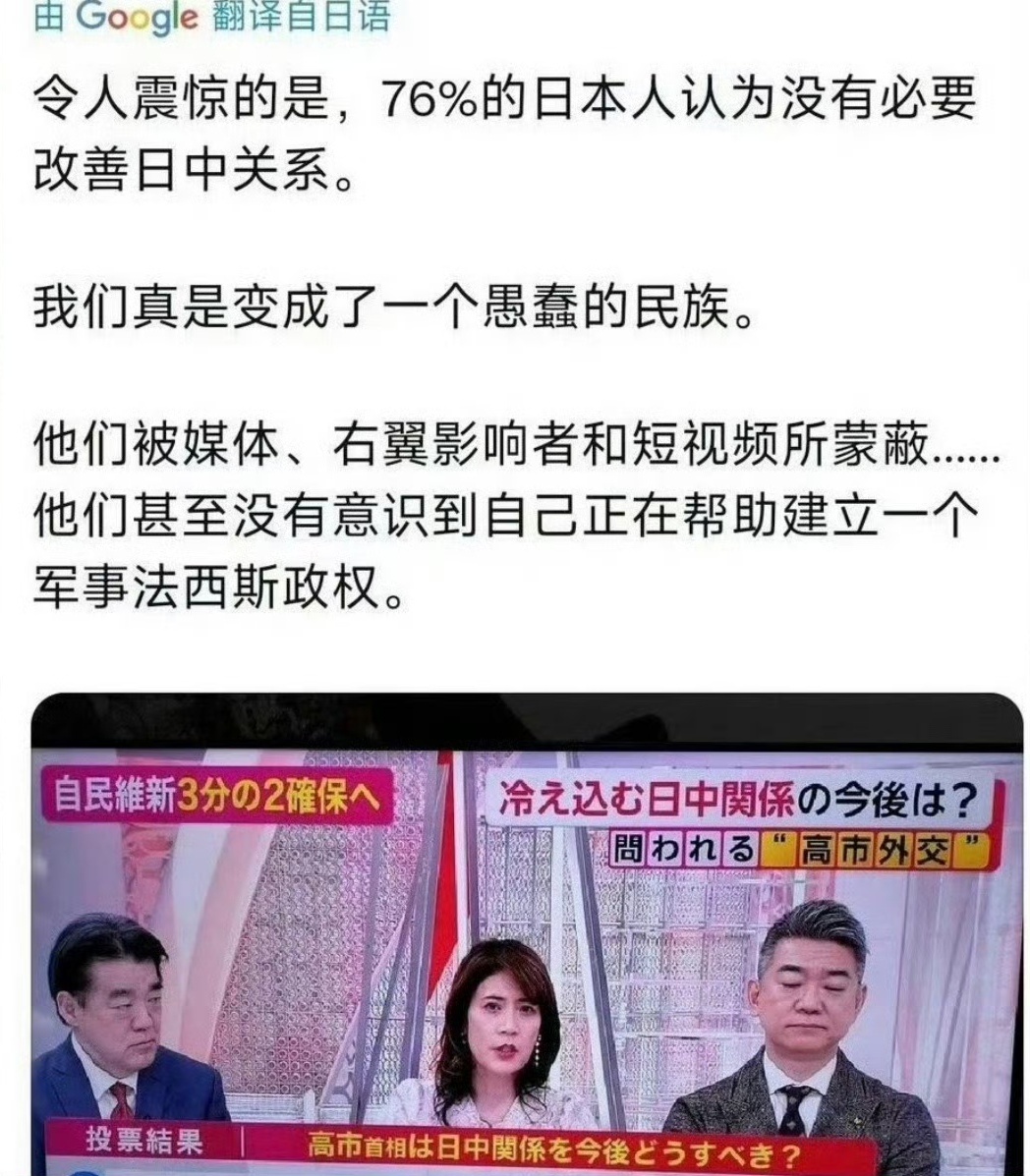 高市早苗此次大胜,绝非简单的民意选择,而是日本政治生态的彻底右倾与失衡。当前,日本人普遍认同修正主义的历史观,在否定、美化侵华历史这件事上,整个日本都是右翼,所以高市早苗才能得“民心”,日本政客把争议归咎给右翼,只是他们无法回避时的遮羞布,不知情者以为是少数极端分子在干坏事,其实整个日本都是右翼。日本彻底失控时事满谈