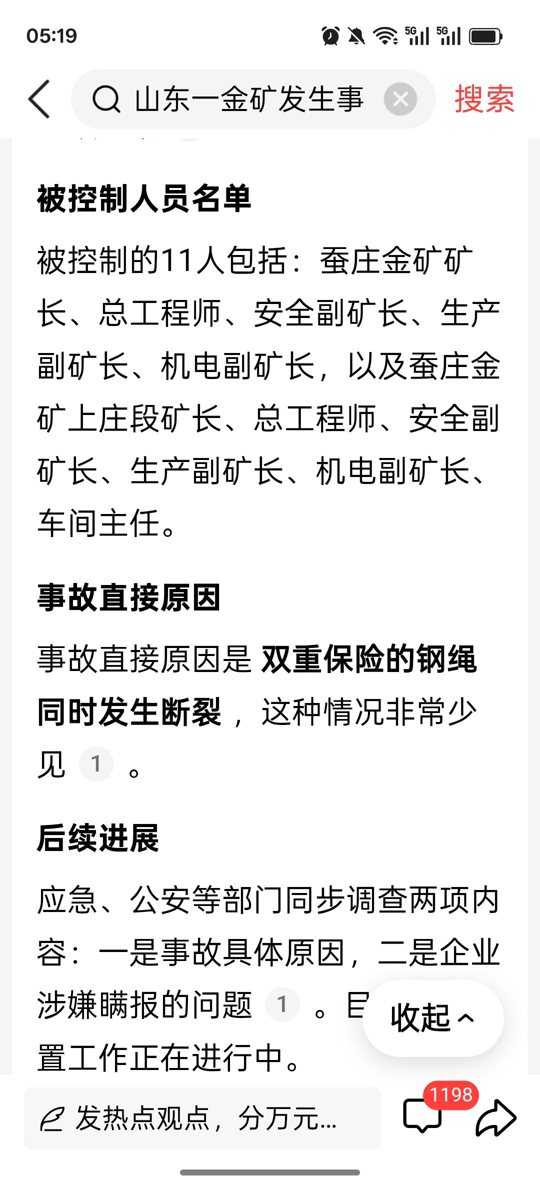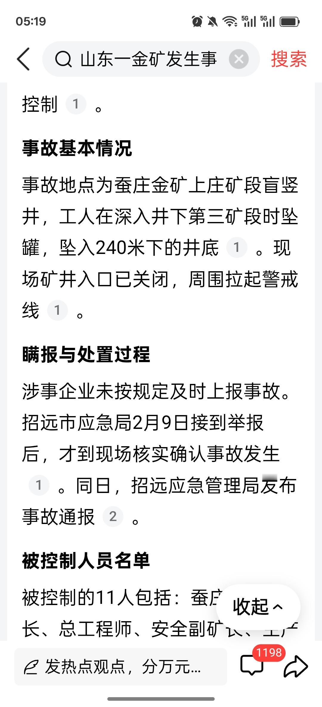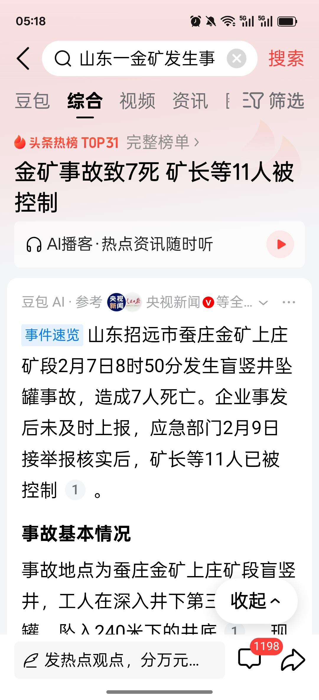 怎么还有人敢瞒报事故? 2月7日早晨8点多钟,招远蚕庄金矿发生罐笼坠井事故,七人遇难。事发后公司负责人没有第一时间汇报上级,竟然又搞起了瞒报这一套。东窗事发后,公司的主要负责人都被控制,要依法追究责任。 其实很多矿山事故的发生,背后都有管理混乱、责任不明、敷衍塞责的影子。这些人之所以瞒报,我估计他们在拖延时间,想去做点别的工作,来掩盖自己的工作失误。这下完了,用一个更大的错误来掩盖原来的错误,恐怕他们要吃不了兜着走了。 前几年邻市(县级市)也发生过金矿事故,市委书记因为瞒报,到现在还在里面蹲着呢!