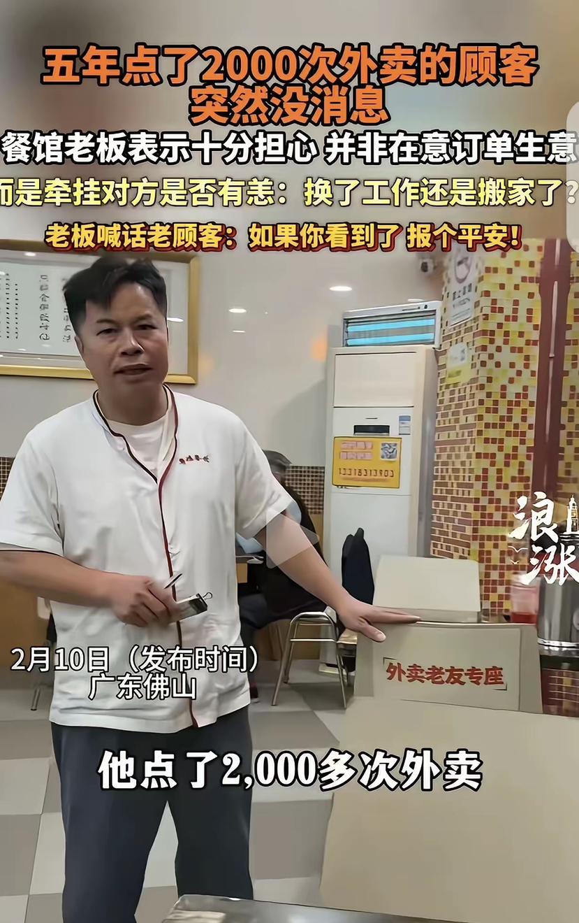 广东佛山,一男子开了家粤菜馆,有个顾客5年点了2000次外卖,突然1年多都没下单,男子很是牵肠挂肚,他不是想挣这个顾客的钱,而是担心对方的安危,不知道是换工作了还是搬家了,男子喊话:如果你看到了,报个平安! 5年累计下单超2000次,平均下来几乎天天都点,这位顾客早把这家粤菜馆当成了离不开的日常食堂。老板做的是佛山老牌街坊生意,不靠营销造势,不玩低价套路,凭的是稳定的粤式口味、实在的分量,守住了老食客的胃,更守住了彼此的信任。他守着灶台十几年,迎来送往无数食客,唯独对这位素未谋面的熟客,悄悄记在了心里。 年关将近,店里备足了年货食材,后厨烟火不停,老板却总忍不住翻看旧订单。连续5年的准时下单,和突然中断的一年多形成刺眼的对比,他心里的慌全是实打实的担忧。他没去查顾客地址,没借机炒作引流,只是对着镜头轻声喊话,还在店里特意留了专座,就盼着对方能看到,报一句平安。 佛山的市井餐饮,向来藏着岭南人的温厚与务实。从百年老字号到街边小馆,老广做吃食,讲究味正心诚,更看重邻里情分。一煲老火汤、一碟炒河粉,装的不只是滋味,更是过日子的踏实。这位老板的牵挂,从来不是惦记那几单利润,而是怕那个天天吃自己家饭的人,遇上难处、过得不安。 如今餐饮行业总在谈流量、算复购、拼营收,太多商家把顾客当成冰冷的消费数据,忘了餐饮最本真的底色是烟火与人情。2000单的利润微不足道,5年的默默陪伴却弥足珍贵。这份不掺功利的牵挂,戳中了太多人心里对真诚与温暖的渴望。 素未谋面却牵肠挂肚,无关利益只盼平安,这才是市井生活里最动人的温柔。 各位读者你们怎么看?欢迎在评论区讨论。