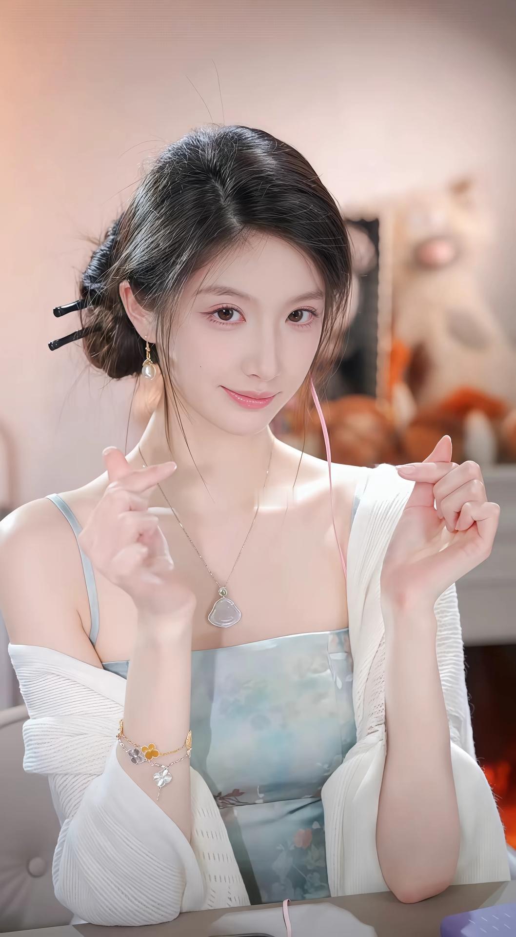 女孩子怎么穿搭既时尚又好看? 这几张照片中的主角是琳园长,一位活跃于抖音平台的网红与模特。她以清新自然的风格和甜美亲和的形象受到关注。 从画面来看,琳园长身着浅青色印花吊带裙,外搭一件白色针织开衫,整体造型温柔雅致,充满夏日气息。她的发型为低盘发,搭配黑色发簪,增添了几分古典韵味。颈间佩戴一枚淡紫色玉石吊坠,手腕上则有金色四叶草手链与玉镯,细节处尽显精致。 她通过不同的手势与表情——如轻捏脸颊、比心、托腮、指尖轻点——展现出俏皮、温柔、沉思等多重情绪,营造出一种“邻家女孩”的亲切感。背景柔和模糊,隐约可见玩偶与室内陈设,进一步强化了温馨私密的氛围。