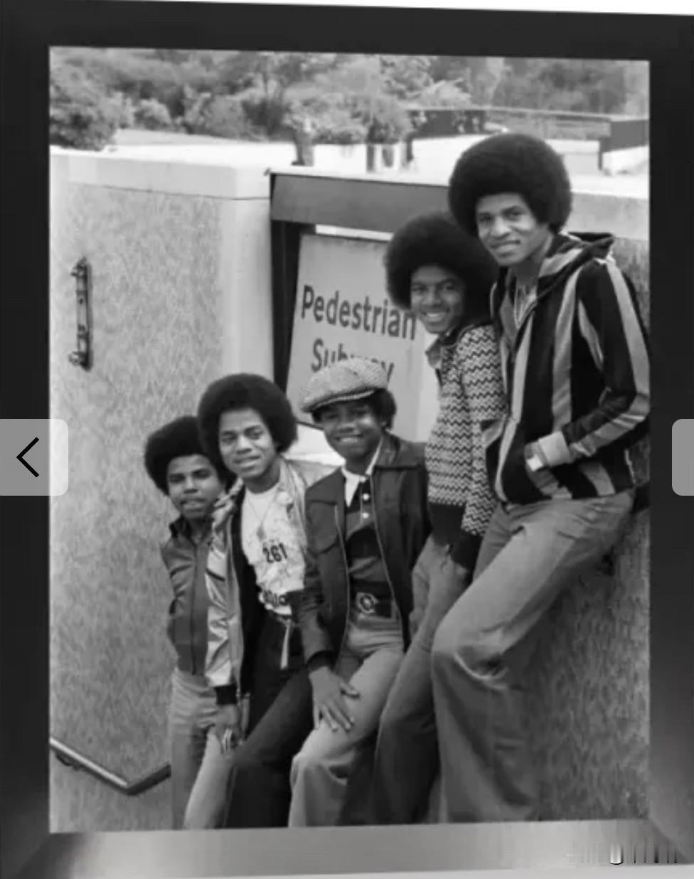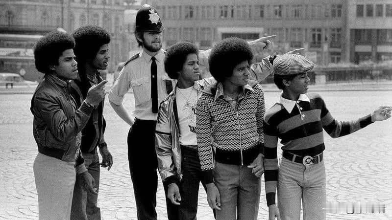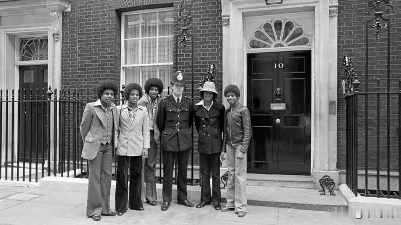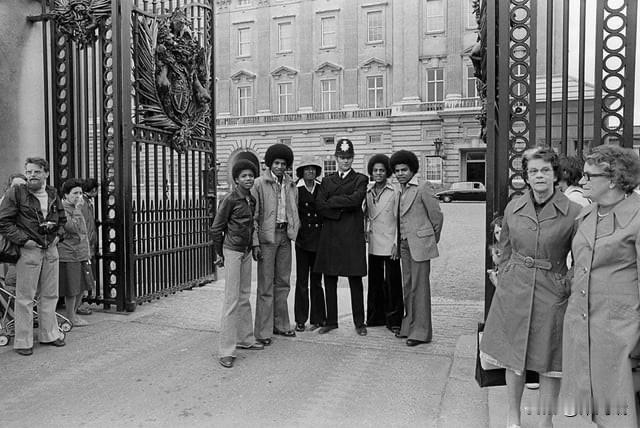 这是一张1977 年流行组合 Jacksons(前身为 Jackson 5)在伦敦白金汉宫门外与一名警察的合影。 这次拍摄发生在 1977 年 5 月 19 日,由摄影师艾伦·奥利(Allan Olley)拍摄。当时,该组合正在伦敦进行巡回演出,并借此机会在伦敦的各大旅游景点拍摄了一系列宣传照,除了白金汉宫外,他们还去了海德公园角(Hyde Park Corner)等地。 照片中的人物 从左至右依次为: 兰迪·杰克逊 (Randy Jackson),当时 15 岁。 杰基·杰克逊 (Jackie Jackson),当时 26 岁。 迈克尔·杰克逊 (Michael Jackson),当时 18 岁。 一名伦敦警察。 马龙·杰克逊 (Marlon Jackson),当时 20 岁。 狄托·杰克逊 (Tito Jackson),当时 23 岁。 在那段时期,Jacksons 组合还参加了为庆祝伊丽莎白二世女王登基银禧纪念(Silver Jubilee)而举行的皇家大汇演(Royal Variety Performance)。