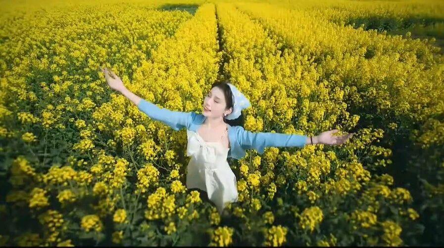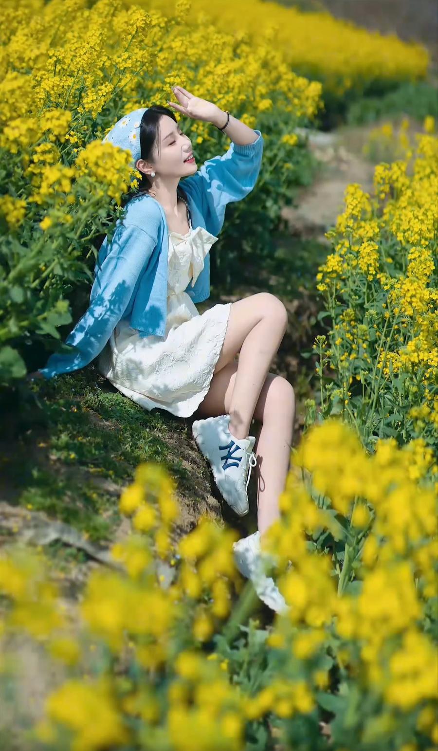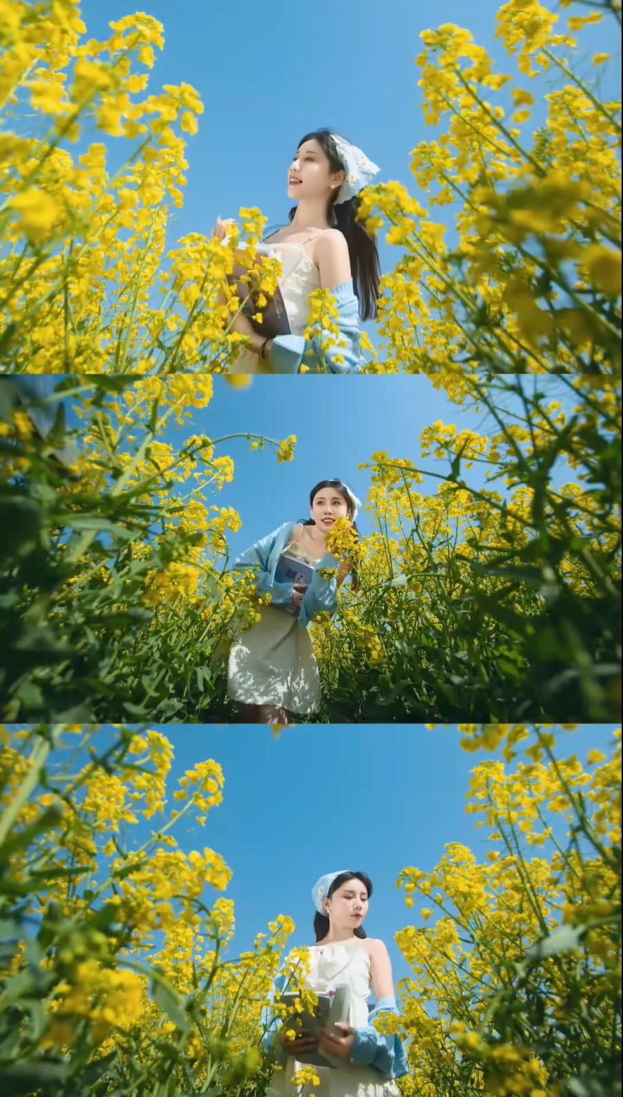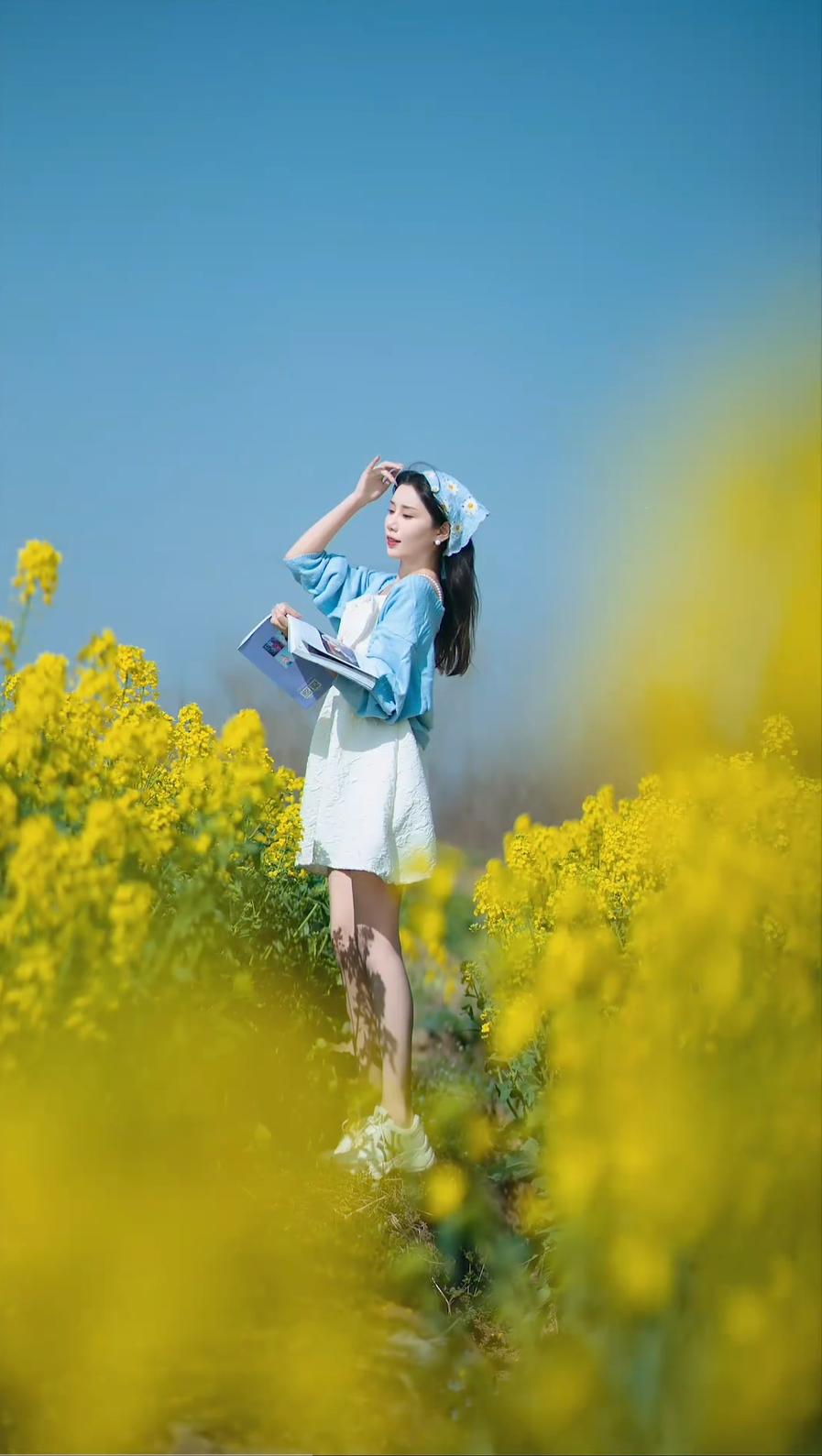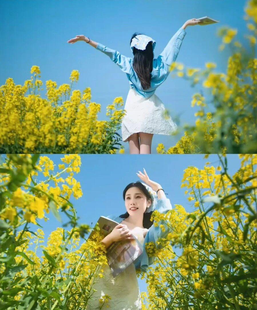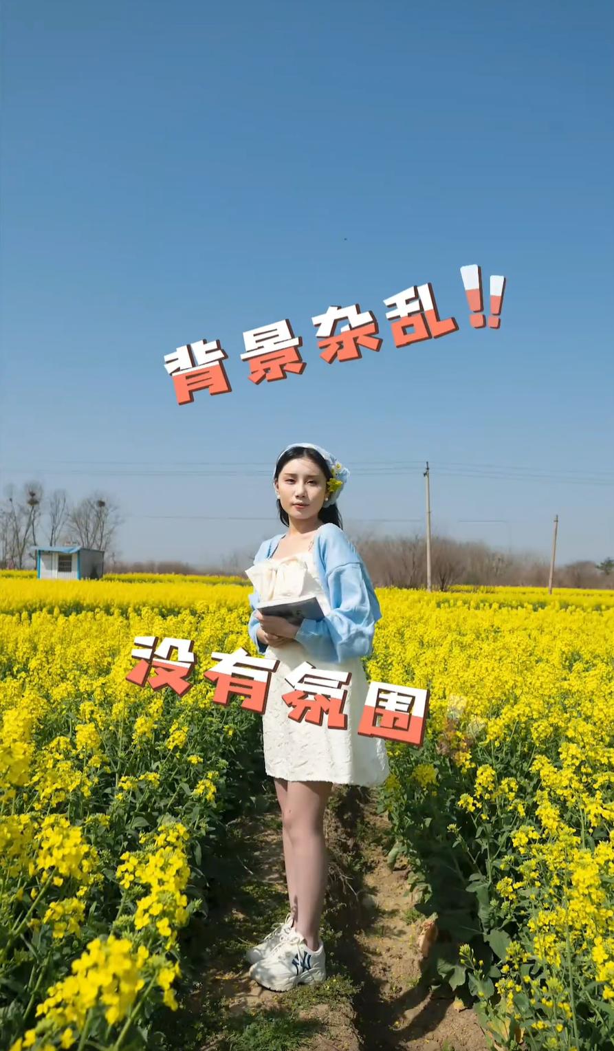 从构图与动作来看,她或坐于田埂,或站立于花丛中,或张开双臂拥抱自然,或低头阅读,姿态多样,展现出轻松愉悦的情绪。背景是大片盛开的油菜花,阳光明媚,天空湛蓝,营造出“春暖花开”的视觉效果。 最后一张图片中,她站在花田小径上,背景中可见远处的电线杆和小屋,画面上叠加了“背景杂乱!!”“没有氛围”的文字,这可能是对拍摄环境的自嘲或后期处理前的原始状态展示,与前面精心构图的照片形成对比,突显了摄影后期或选景的重要性。