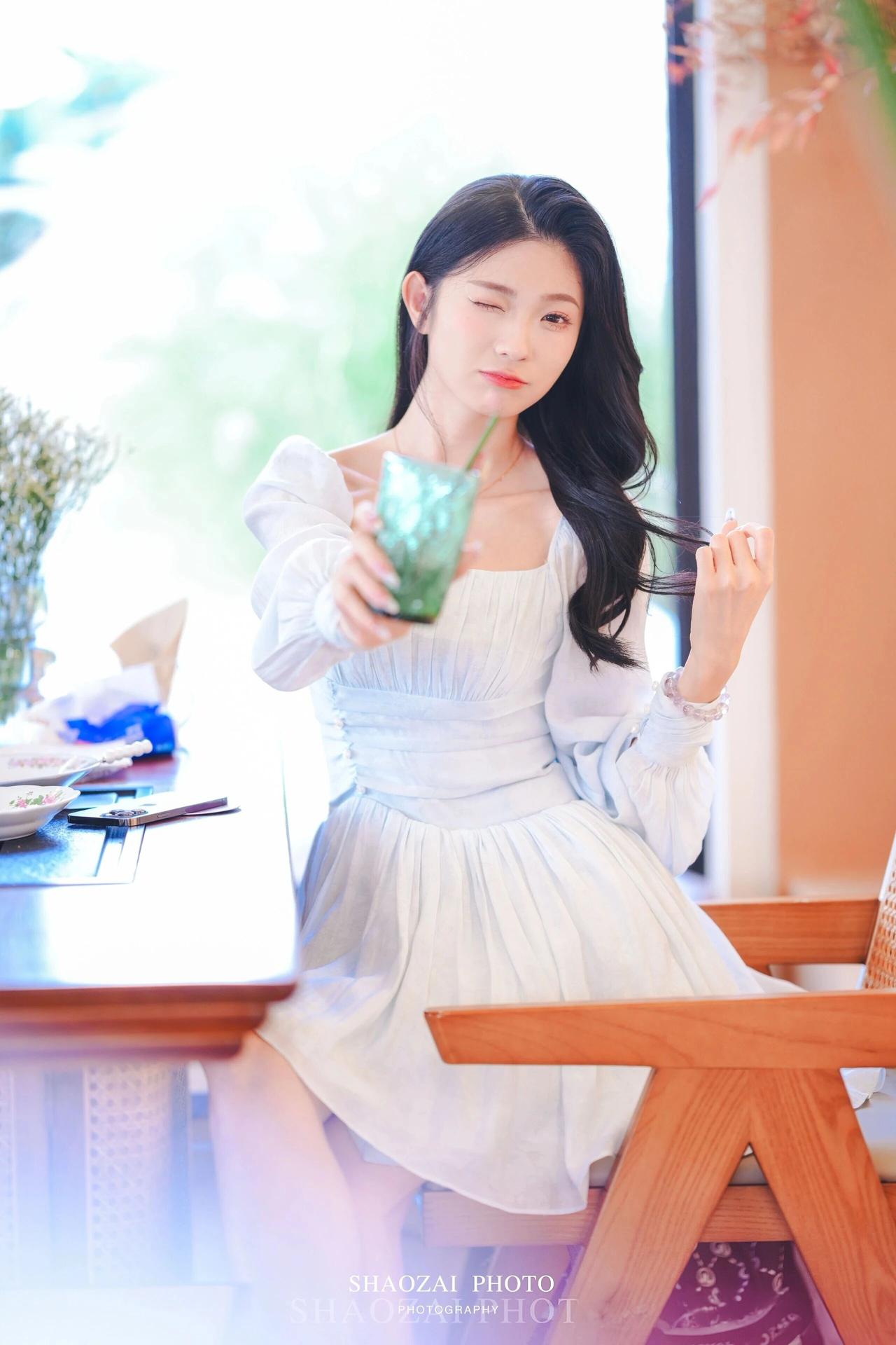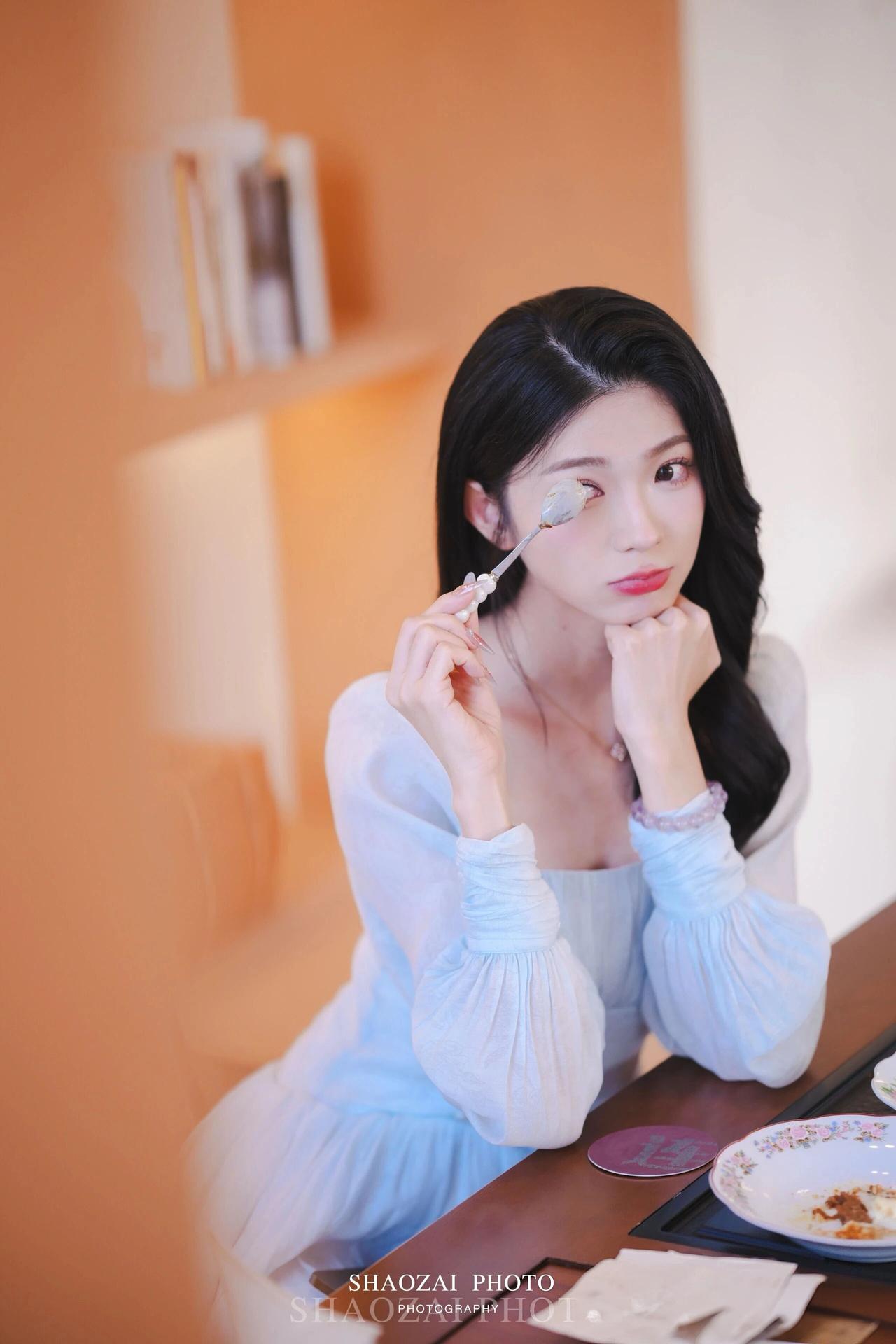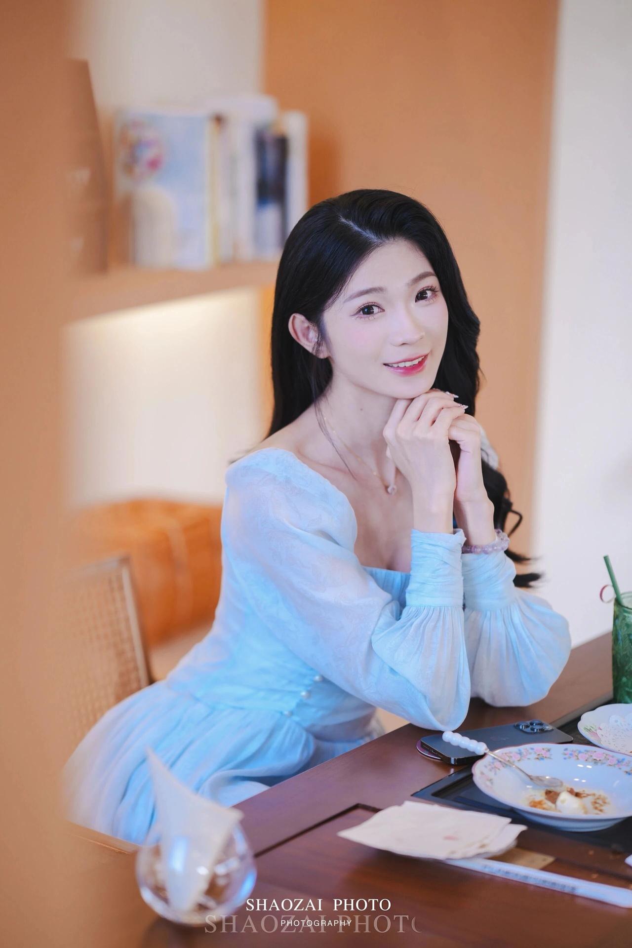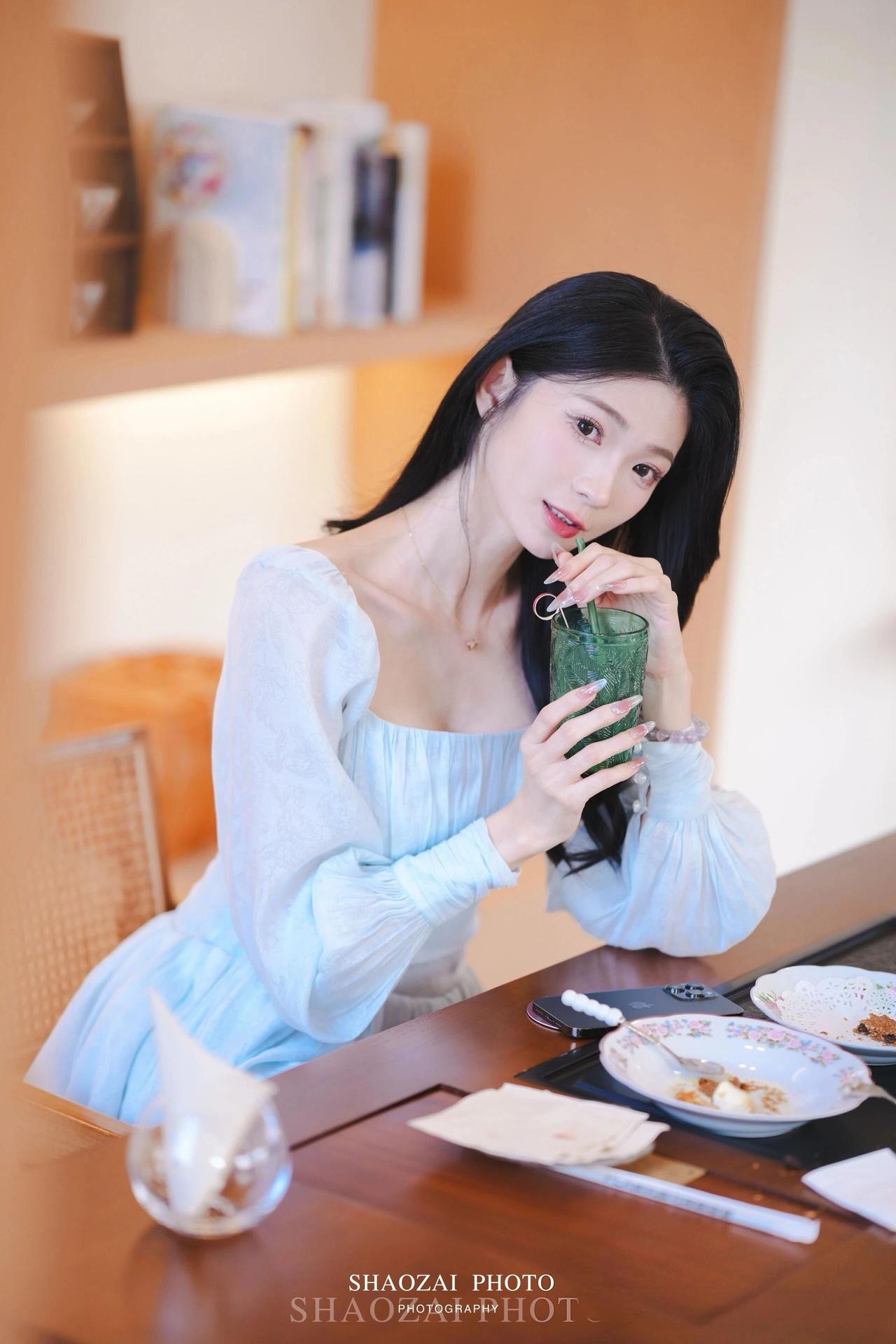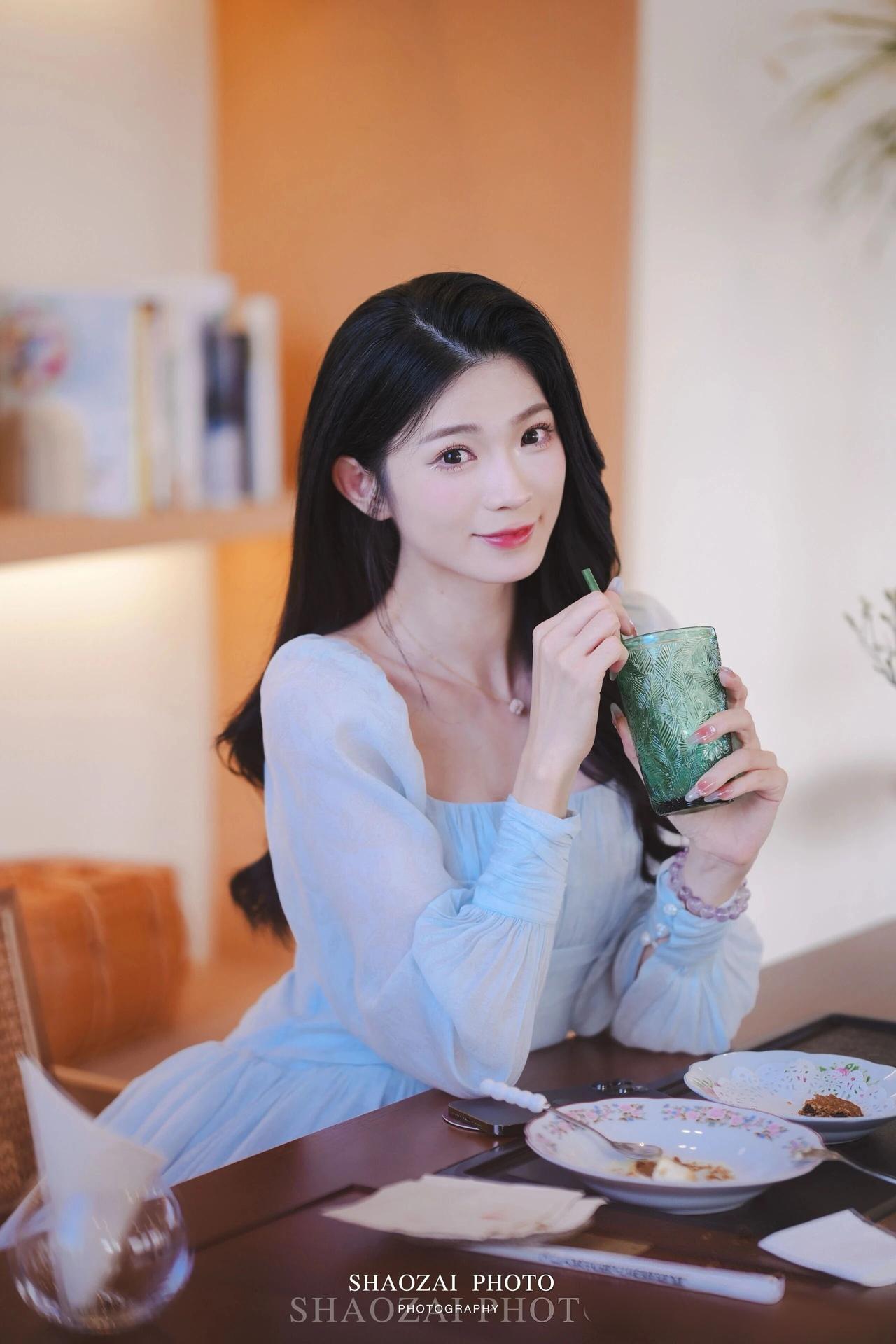 这组照片的主角是晓霞,一位活跃于车展的模特。她身着一袭浅蓝色泡泡袖连衣裙,搭配精致的珍珠手链与项链,整体造型温柔优雅,充满夏日清新气息。照片拍摄于一家温馨的咖啡馆内,背景是暖橙色的墙面与木质书架,阳光透过窗户洒在她的发梢与裙摆上,营造出静谧而浪漫的氛围。 晓霞在镜头前展现了多种自然生动的姿态:时而手持绿色玻璃杯轻啜饮品,时而托腮凝视镜头,时而俏皮地用勺子遮住一只眼睛,时而双手捧花微笑。每一张照片都捕捉到了她灵动的眼神与甜美的笑容,将少女的纯真与优雅完美融合。这组写真不仅展现了她的个人魅力,也传递出一种悠闲惬意的生活态度,非常适合用于社交媒体分享或个人形象展示。