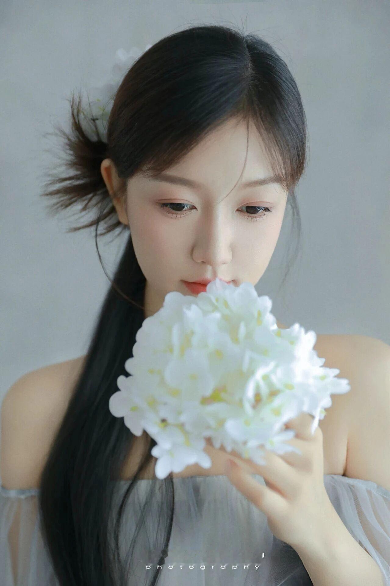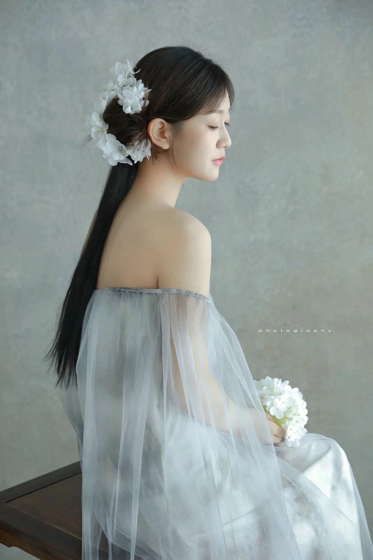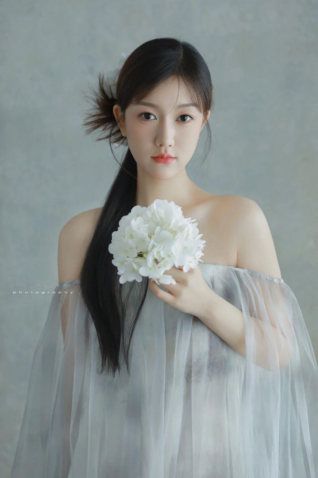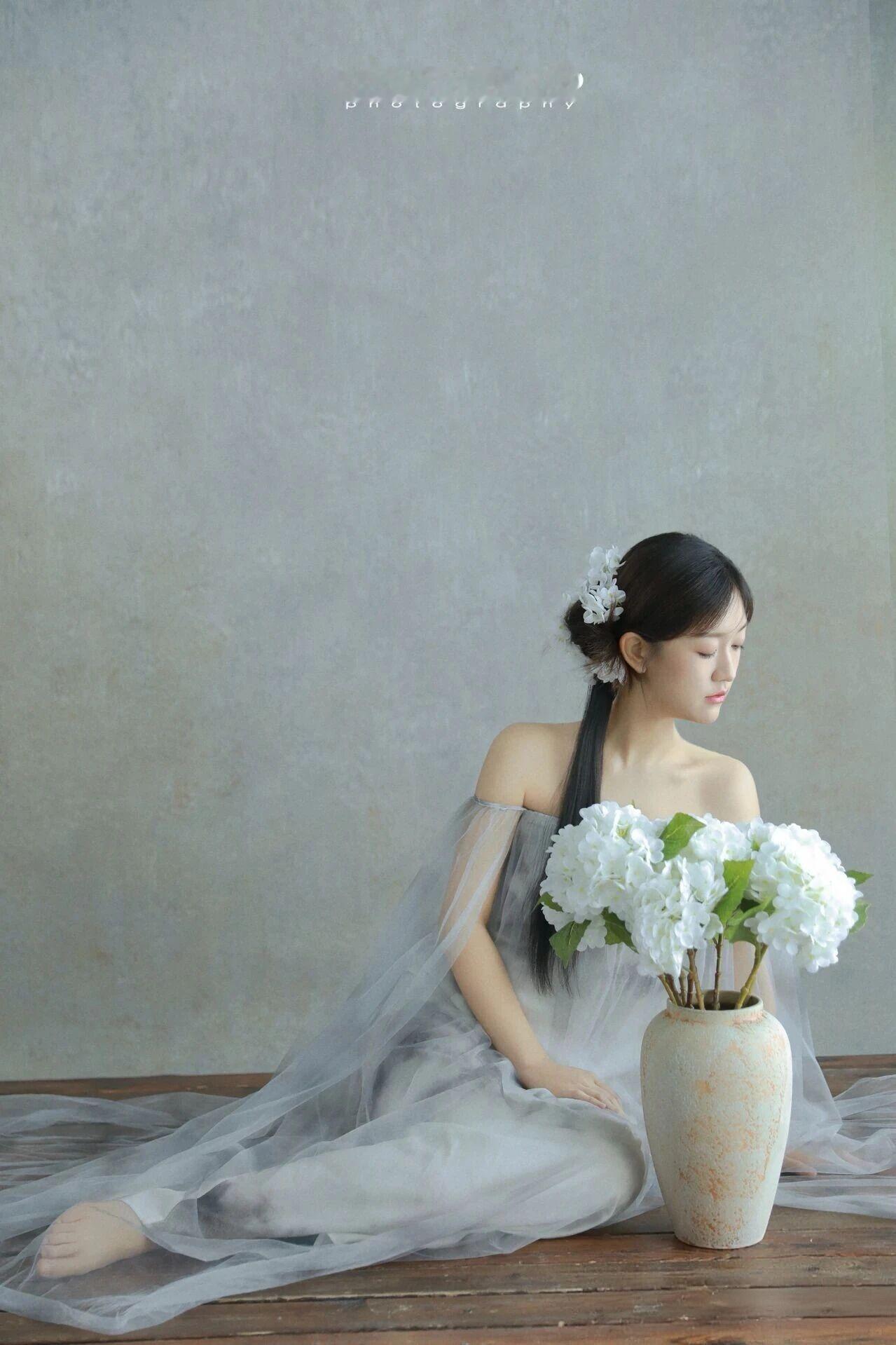 记录我的2026她身着轻盈的浅灰纱裙,长发低绾,几朵白色小花点缀其间,宛如从画中走出的仙子。手捧一束洁白绣球,眼神温柔低垂,仿佛在与花轻语,又似在聆听风的私语。背景是素雅的灰墙,木质地板透着岁月的温润,光影柔和,氛围静谧。每一张照片都像一首无声的诗,诉说着纯净与美好。